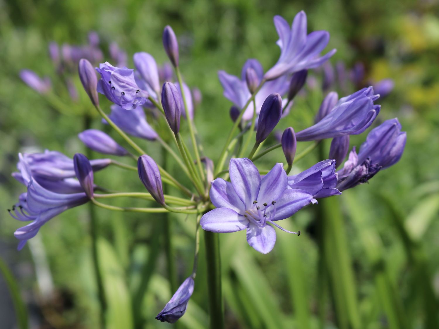 Die Pflanze fällt mit ihren bis zu 100 cm hohen Blütenstielen auf! Mit den langstieligen Agapanthus-Pflanzen kann der Gartenfreund großartige Szenerien schaffen. Die Afrika-Schmucklilie 'Jacaranda' besitzt ein dichten Wurzelballen und bildet elegante Blätter in glänzendem Grün aus. Daraus erheben sich die grünen Stängel mit ihrem kostbaren Blütenball. Agapanthus africanus 'Jacaranda' entwickelt sich optimal an einem Sonnenplatz. Das aparte Ziergewächs liebt einen warmen Standort und verträgt Hitze ohne Probleme. Die Afrikanische Schmucklilie bevorzugt einen normalen, durchlässigen und nährstoffreichen Boden. Die vertrockneten Blüten schneidet der Gartenfreund mit den Stängeln ab. Den ganzen Sommer über wachsen an der Afrika-Schmucklilie 'Jacaranda' neue Blüten nach. Die Staude ist winterhart und sogar Temperaturen bis -15 °C machen ihr wenig aus. Kübelpflanzen überwintern am besten frostfrei. Die Afrika-Schmucklilie 'Jacaranda' erfreut den Blumenliebhaber langjährig. Sie verleiht dem Garten oder der Terrasse einen feinen, mediterranen Touch. Die seit dem 16. Jahrhundert beliebten Pflanzen haben bis heute nichts von ihrer Faszination und von ihrem Charme verloren.