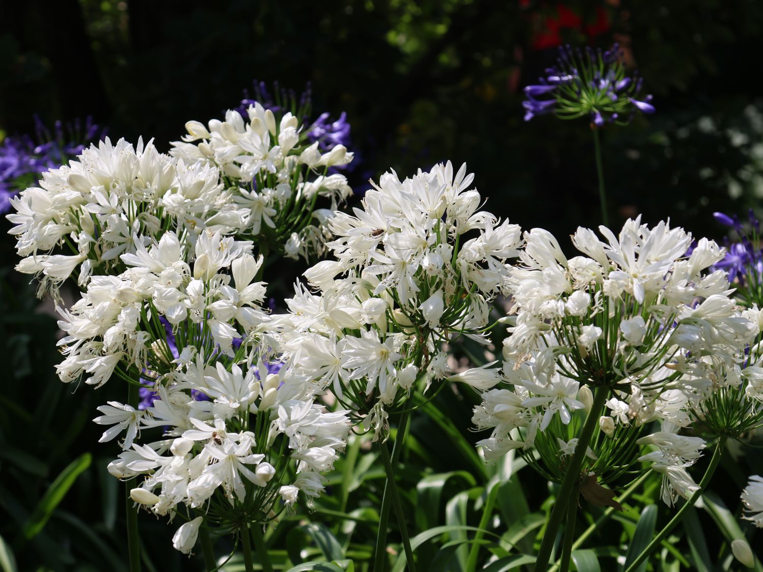 Die Afrika-Schmucklilie 'White Heaven' ist eine mehrjährige Staude mit weißen, ballförmigen Blütenständen. Von Juli bis September erblühen die vielen kleinen Einzelblüten und fügen sich doldenartig an einem Stengel zusammen. Die Blätter der sommergrünen Staude sind lineal und dunkelgrün. Sie wachsen bogig und überhängend. In ihrer Heimat Südafrika wächst die Staude in felsigen Gebieten und im offenen Grasland. An einem Standort in der Sonne kann sie bis zu einem Meter hoch und 70 Zentimeter breit werden. Sie kommt mit trockener Hitze sehr gut aus, mag es aber windgeschützt. Bot. Agapanthus africanus 'White Heaven' bevorzugt durchlässigen und nährstoffreichen Boden. Ist der Boden sehr verdichtet, sollte vor dem Einpflanzen etwas Sand hinzugefügt werden. Im Beet macht sie sich besonders gut. Da sie nur bedingt winterhart ist, eignet sie sich besonders für die Bepflanzung von Kübeln. Als Schnittblume ist sie aufgrund ihrer imposanten Blüten sehr beliebt. Auch im Kübel auf dem Balkon und der Terrasse entfaltet Afrika-Schmucklilie 'White Heaven' ihre Blütenpracht zur vollen Schönheit. Ist sie gut geschützt, verträgt sie Temperaturen bis zu -6°C. Bienen und andere Insekten lieben den süßen Nektar der Blüten. Die Staude passt hervorragend in eine größere Gruppenpflanzung mit mehreren Exemplaren. Doch auch mit Rosen und anderen Pflanzen gibt sie ein stimmiges Bild ab.