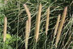 Das Afrikanische Lampenputzergras ist eine interessante Grasart, die hohe Blütenstängel, eine dichte Belaubung und eine ausdauernde Blüh- und Wuchsfreude prägt. Dieses Gras legt ein energisches Erscheinungsbild an den Tag, denn aus dem Zentrum seines Horstes strecken sich kräftige Halme nach oben und schaffen eine Silhouette, die zugleich straff und leicht gebeugt anmutet. Die Basis bleibt dicht geschlossen und bodendecckend, während die oberen Partien mehr Leichtigkeit entwickeln und fast luftig rhythmisierte Linien zeichnen. Diese Mischung aus buschiger Fülle und klarer Aufrichtung passt zu seiner Art, sich mit der Zeit über Ausläufer auszuweiten und Flächen in gleichmäßigem Tempo zu erobern. Als krautige, langlebige Süßgrasart zeigt (bot.) Pennisetum macrourum ein konstantes Wachstum, das im Jahreslauf kaum ins Stocken gerät und schließlich Höhen bis 140 cm erreicht. Die Breite bleibt mit 80 cm moderat und sorgt für einen runden, stabilen Aufbau, der Beeten Struktur und ein dekoratives Flair verleiht. Die Blätter tragen entscheidend zu diesem Eindruck bei, denn ihre linealen, lanzettlichen Formen legen sich wie lange, geschmeidige Bänder aus. Die Spitzen laufen scharf zu; der Grundton zeigt ein sattes Mittelgrün, das ohne Unterbrechung durch die warme Jahreszeit führt. Da das Gras in milden Regionen wintergrün bleibt, begleitet die Belaubung dort auch den Winter, während das Laub in kalten Wintergebieten sommergrün ist. Ab Juni strecken sich Blütentriebe deutlich über das Laub hinaus und tragen bis Oktober große, ährenförmige Blütenstände, an denen goldgelbe bis strohgelbe, unscheinbare Blüten wachsen. Durch ihre Länge bis zu 20 cm und die leichte Auflockerung an den oberen Zentimetern entsteht ein charakteristischer Ausdruck, der weit über die typische Wirkung vieler anderer Ziergräser hinausreicht. Insekten suchen das Afrikanische Lampenputzergras auf, da die Ähren Nahrung bieten.