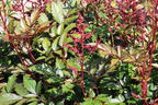 Die Arends Prachtspiere 'Granat' verfügt über eine Winterhärte um -25°C, sodass sich ein Winterschutz in unseren Breiten fast überall erübrigt. Eine Schicht Laub oder Mulch im Herbst tut der Astilbe dennoch gut, denn eine solche Decke versorgt die Pflanze nicht nur mit Nährstoffen, sondern sie hält auch den Boden frisch und feucht. Das ursprüngliche Herkunftsgebiet der Astilben ist der Osten Asiens, wo sie in Ländern wie China, Japan und Korea natürliche Habitate, etwa an fließenden Gewässern oder in lichten Wäldern in beträchtlichen Höhenlagen, haben. An den frühen Züchtungen der Hybrid-Prachtspieren, zu denen die Astilbe x arendsii 'Granat' gehört, waren als Mutter- und Vaterpflanzen Arten wie die Astilbe thunbergii, die Astilbe japonica und die Astilbe chinensis beteiligt. Die Arends Prachtspiere 'Granat' gehört zur mittleren Blütezeitgruppe, die im Hochsommer ihre ganze Pracht entfaltet und schattige Gartenbereiche aufwertet. Die prächtige, purpurfarbene Astilbe verfügt über beste züchterische Eigenschaften. Die Triebe bilden einen dichten Busch, sie blüht bis zu sechs Wochen, treibt im Frühjahr bronzefarben aus und erneuert sich von Grund auf. Die Prachtspiere ist langlebig, wächst stetig, aber nicht übermäßig, und setzt von Jahr zu Jahr mehr Blütenrispen an. Da sie keine Ausläufer treibt, wuchert sie nicht, und sie hat standfeste Stiele sowie glänzendes Laub. Sie lässt sich hervorragend mit andersfarbigen Sorten von Arends Prachtspieren kombinieren, aber auch mit Funkien, Ziergräsern und Farnen.