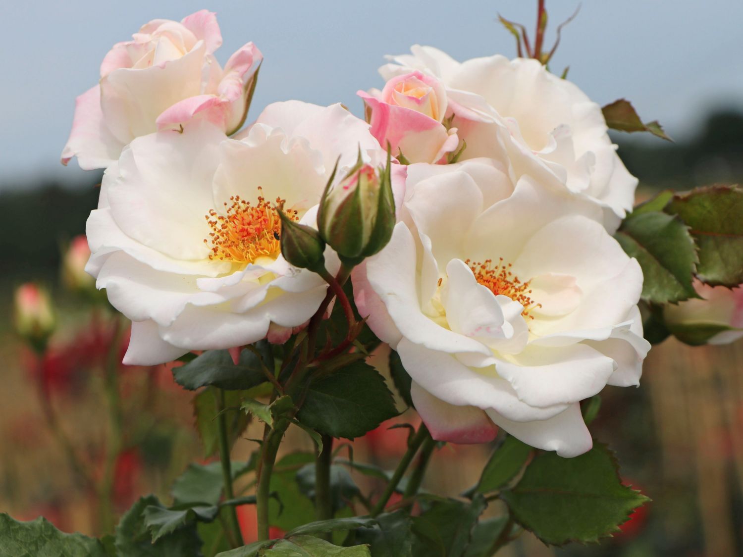 Die Beetrose 'Eisprinzessin' ® (bot. Rosa 'Eisprinzessin' ®) erblüht reinweiß. Viel Sonneneinstrahlung überzieht die Blütenblätter mit einem zarten, reizvollen rosa Schimmer. Die leuchtend gelben Staubgefäße in der Blütenmitte der in Dolden stehenden Blüten sind der Mittelpunkt der kühlen Schönheit. Große tief dunkelgrüne fein gezähnte Blätter umrahmen die weißen Blüten dekorativ. Die Beetrose 'Eisprinzessin' ® ist eine Floribundarose mit großen Blüten, die Bienen und Insekten anzieht. Ihr Duft ist leicht bis zu nicht wahrnehmbar, was der kühlen Schönheit gut zu Gesicht steht. Die schlanke Rose wird bis zu 80 Zentimeter hoch. Dadurch eignet sie sich perfekt für einen größeren Pflanzkübel, als Vorpflanzung vor hohen Stauden und für schmale Rabatten. Im Durchmesser erreicht sie zirka 50 Zentimeter. Rosa 'Eisprinzessin' ® füllt Lücken unter hohen Stauden und geht mit zartem Schleierkraut eine sehenswerte Symbiose ein. Die Farbkomposition des blühenden Strauches wirkt ruhig und vornehm. Die Rose blüht jede Saison mehrmals. Sie ist ein beliebtes Gestaltungselement im Garten.