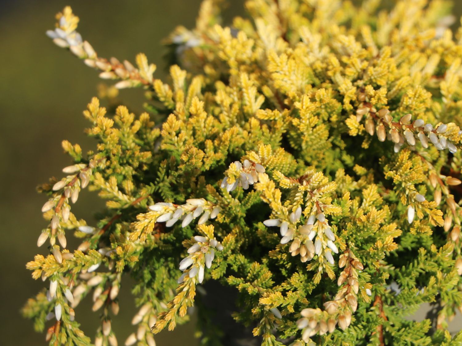 Die Besenheide Rasta Girls ® 'Netty' ist eine wundervolle Sorte innerhalb der bekannten Serie der Rasta Girls ®. Diesen Namen trägt sie nicht von ungefähr. Denn diese besonders laubschöne Variante birgt viele schöne Eigenschaften in sich. Die weißen Knospenblüten von (bot.) Calluna vulgaris Rasta Girls ® 'Netty' öffnen sich nicht und bleiben auf diese Weise deutliche länger erhalten. Das gelbe bietet einen schönen farblichen Kontrast zur weißen Blüte. Durch den überhängenden Wuchs eignet sich die Besenheide Rasta Girls ® 'Netty' perfekt für Kübel und Töpfe in erhöhter Position. Das immergrüne Laub ist nadelförmig und zeigt sich ganzjährig ansprechend und dekorativ. In der Zeit zwischen September und Oktober zeigen sich an der Besenheide Rasta Girls ® 'Netty' die kleinen, weißen Knospenblüten. Sie erscheinen in einer unglaublich großen Anzahl. Da die Blüten an dieser Pflanze geschlossen bleiben, sind sie besonders robust gegenüber Regen, Frost und Nebel.