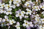 Das Blaukissen 'Regado White' verzaubert Steingärten, Felsspalten und Rabatten mit seinem weißen Blütenmeer. Der Bodendecker ziert sich mit unzähligen kleinen Blüten. Die hübsche Staude (bot.) Aubrieta x cultorum 'Regado White' ist während der Blütezeit komplett von zierlichen Blüten bedeckt. Ein Blütenmeer, das jeden Blick auf sich zieht. Diese üppige Pracht erscheint Anfang April und blüht durchgängig bis Ende Mai. Durch die Vielzahl an Blüten entfaltet sich vor dem Betrachter ein wahres Blütenmeer in zartem Weiß. Die zierlichen Blüten setzen sich aus vier Kronblättern zusammen, die die Form eines Kreuzes vermitteln. Sie machen die Verwandtschaft mit den Kreuzblütlern deutlich. Der blühende Teppich zieht den Betrachter in seinen Bann. Auch bei Bienen und anderen Insekten steht die Nektarpflanze hoch im Kurs. Sie suchen die weißen Blüten in großer Zahl auf und beleben auf zauberhafte Weise den Garten. Nach dem Verblühen nehmen kleine Schoten den Platz der Blüten ein. Auch diese machen das Blaukissen 'Regado White' zu einem dekorativen Bodendecker. An sonnigen Standorten fühlt sich Aubrieta x cultorum 'Regado White' am wohlsten. Die Ansprüche der Staude an den Boden sind gering. Auf neutralem und steinreichem Boden gedeiht sie am besten. Der Gärtner beachtet, dass das Blaukissen keine Staunässe verträgt. Diesem Wunsch kommt der Gärtner mit einem Kiesbett als Untergrund nach. Auch mit untergemischtem Sand erzielt er eine ausreichende Drainage und ein Substrat, in dem das hübsche Blaukissen gerne wächst. Flach kriechend erreicht die kleine Staude eine Höhe von bis zu zehn Zentimetern. Seine wahre Größe entfaltet das Blaukissen 'Regado White' in seiner Breite. Die kriechende Pflanze erreicht eine Breite von bis zu 30 Zentimetern. Sie bildet dichte, im Frühjahr blühende Polster, die noch im Winter überzeugen.