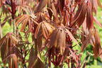 Die Chinesische Rosskastanie füllt Räume mit einer majestätischen Selbstverständlichkeit und frühen Blütenpracht, wirkt ausgewogen sowie kräftig und ist von exotischer Noblesse geprägt - ein Baum, der Eleganz und Beständigkeit ausstrahlt. Mit seinem dicht verzweigten, buschig aufrechten Wuchs entwickelt er sich im Laufe der Jahre zu einem beeindruckenden Solitär, dessen Krone sich weit auslegt und damit eine imposante Spannweite erreicht. Die Krone nimmt mit zunehmendem Alter eine rundliche Form an, die trotz ihrer Fülle sehr gediegen aussieht. Junge Exemplare zeigen ein lebhaftes Wachstum, das mit 40 bis 60 cm pro Jahr rasch sichtbare Dimensionen annimmt. Auf einer Breite von bis zu 1500 cm und einer Höhe von etwa 2000 cm entfaltet sich (bot.) Aesculus chinensis var. wilsonii zu einem eindrucksvollen Exemplar, dessen Erscheinung weit über das Gewöhnliche hinausgeht. Besonders auffällig ist das Laub, das durch seine handförmig gefiederten Blätter eine herausstechende Struktur besitzt. Jedes Fiederblatt zeigt eine länglich-keilförmige bis elliptische Form und einen gezähnten Rand, während die Unterseite eine zarte, graue Behaarung trägt, die dem Blattwerk ein samtiges Flair verschafft. Im Frühjahr überrascht der Baum mit einem leuchtend purpurfarbenen Austrieb - ein seltener Anblick, der die exotische Herkunft des Gehölzes betont. Später wechseln die Blätter in ein sattes Dunkelgrün, durchzogen von rötlichen Adern, die im Hochsommer wieder schwinden. Im Herbst folgt ein herbstliches Feuerwerk aus Gelb-, Orange- und Rotnuancen, das den Baum in eine leuchtende Farbpoesie taucht und seine Jahreszeitentauglichkeit spektakulär unterstreicht bevor sich das sommergrüne Laub bis zum Frühjahr "verabschiedet". Von April bis Juni tragen die kräftigen Triebe große, aufrechte Blütenstände von bis zu 40 cm Länge. Die einfach gebauten Einzelblüten thronen an diesen in einem klaren Weiß, in dessen Zentrum sich gelbe Flecken abzeichnen - ein Farbkontrast, der im Sonnenlicht besonders apart zur Geltung kommt. Ihr feiner, angenehmer Duft zieht zahlreiche Insekten an und macht den Baum zu einer wichtigen Nahrungsquelle für Bienen und andere Bestäuber. Im Spätsommer entwickeln sich daraus gelblich-braune, kugelige Früchte mit glatter, leicht lederner Oberfläche, die in ihrer Form an kleine Kastanien erinnern. Auch wenn sie nicht für den Verzehr empfehlenswert sind, schmücken sie die Chinesische Rosskastanie bis weit in den Herbst hinein.