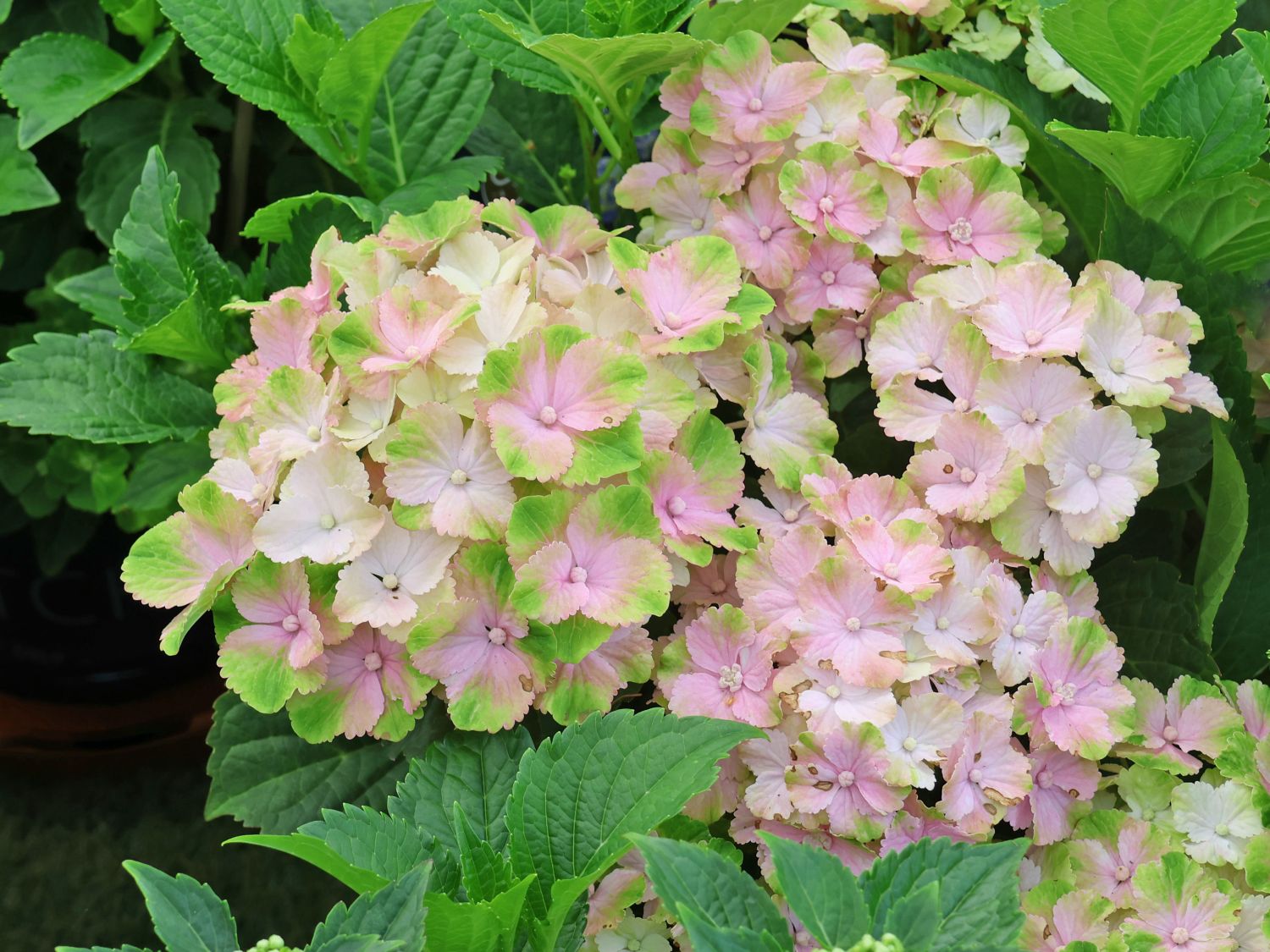 Die Gartenhortensie (S)witch ® 'Thalassa whitepink' verzaubert mit ihren eindrucksvollen, ballförmigen Blütendolden, die im Verlauf der Blütezeit mehrmals die Farbe wechseln. Sie gehört zur Familie der Hortensiengewächse und wurde 2020 in monatelanger Selektion als Teil der Switch ®-Serie lanciert. Im kompakten, breit-buschigen Wuchs entwickelt (bot.) Hydrangea macrophylla (S)witch ® 'Thalassa whitepink' zahlreiche, vielstämmige Triebe. Sie erreichen eine Höhe von 70 bis 100 cm und eine Breite von 60 bis 90 cm und bilden dichte Strauchpolster. Bereits im frühen Frühjahr legen sich die dicklichen Knospen an aufrechten, stabilen Zweigen an, deren Rinde einen dezenten Hellgrau-Ton zeigt. Ab Juli entfalten sich zunächst grünliche Blütenknospen, die rasch zu reinweißen, dann allmählich zu zartrosa und schließlich kräftig pinkfarbenen Blütenkelchen heranreifen. Jede locker strukturierte Dolde besteht aus zahlreichen Einzelblüten mit je vier seidig-glänzenden Kelchblättern. Ihre wechselnde Nuancen wirken wie ein lebendiges Farbschauspiel. Sie brachten dem Strauch den charakteristischen Namen "Switch" ein. Das dunkelgrüne, oval-zugespitzte Laub mit fein gesägtem Rand ist dicht angeordnet und bildet einen effektvollen Hintergrund für die pastelligen Blütendolden. Die Blätter messen 10 bis 15 cm in der Länge, sind außen samtig behaart und zeigen eine markante Mittelrippe, die sich in ein filigranes Netz feiner Blattadern verzweigt. Unter Mitteleuropas sommerlichem Licht schimmert das Laub der Gartenhortensie (S)witch ® 'Thalassa whitepink' tiefgrün. Ein Standort von voller Sonne bis Halbschatten ist ideal, wobei ein Platz mit Morgen- oder Abendsonne die Farbübergänge der Blüten besonders kontrastreich erscheinen lässt. Der Boden sollte frisch, humos und durchlässig sein, zugleich aber kalkarm. Ein zu hoher pH-Wert kann die Farbintensität beeinträchtigen. Ein humoser, leicht saurer Untergrund fördert einen kräftigen Wuchs und reichliche Blütenbildung. Eine gut drainierende Bodenstruktur hilft Staunässe zuverlässig zu vermeiden.