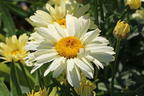 Leucanthemum x superbum 'Banana Cream' wächst buschig, horstbildend und aufrecht. Die Staude bildet aufrechte, schlanke Stängel aus, die eine Höhe von 30 bis 45 Zentimetern erreichen. Ihre Wuchsbreite liegt zwischen 40 und 50 Zentimetern. Der Gärtner pflanzt für eine unübersehbare Blütenpracht acht bis zehn Stauden pro Quadratmeter. Von Juni bis August erscheinen ihre eindrucksvoll großen Blüten. Sie sitzen einzeln auf den Blütenstielen und haben strahlenförmig angeordnete Blütenblätter. Im Zentrum zeigen die Blüten ein kräftiges Goldgelb. Das helle, cremige Gelb der Blütenblätter erinnert farblich an Bananen. Dieser Eindruck diente als Inspirationsquelle für den Namen der Großblumigen Margerite 'Banana Cream'. Mit ihrem zarten, leichten und angenehmen Duft verwöhnen die Blüten die Sinne. Bienen und anderen Nutzinsekten liefern sie wertvolle Nahrung. Leucanthemum x superbum 'Banana Cream' präsentiert schmale, vorn zugespitzte Blätter, die lanzettlich bis spatelförmig erscheinen. Ihr Blattrand ist gesägt und sie schimmern in einem satten Dunkelgrün. Auf Freiflächen bildet eine Gruppe der Großblumigen Margerite 'Banana Cream' ein leuchtendes Blütenmeer. In naturnahen Gärten geht sie wunderschöne Partnerschaften mit weißblühenden Margeriten-Sorten, Lupinen und rotblühendem Mohn ein. Zwischen filigranen Gräsern entfaltet sie einen wild-romantischen Charme. Auf dem Beet und in der Rabatte blüht sie in Gesellschaft von Rittersporn, Schafgarbe und Phlox. Sie ist eine zauberhafte Staude für den Bauerngarten. Im Kübel schmückt Leucanthemum x superbum 'Banana Cream' den Balkon und die Terrasse. Dank ihrer zauberhaften Blüten ist sie eine beliebte Schnittpflanze für Sträuße und Gestecke. In farbenfrohen Blumenbouquets sorgt sie an Regentagen für eine helle, sommerliche Atmosphäre. Die 'Banana Cream' liebt einen sonnigen Standort und gedeiht auf frischen Böden, die gut durchlässig und reich an Nährstoffen sind. Staunässe verträgt die Staude nicht. Nach der Blütezeit schneidet der Gartenfreund die abgeblühten Stängel bis zum grundständigen Blattschopf zurück. Alle zwei- bis vier Jahre ist es sinnvoll die Staude zu teilen und neu auszupflanzen. Das verjüngt die Pflanze und fördert das Bilden von Blüten. Diese schöne Margeriten-Sorte ist bis zu -23 °C winterhart. Dennoch empfiehlt sich im ersten Standjahr ein Winterschutz bei Kahlfrost.