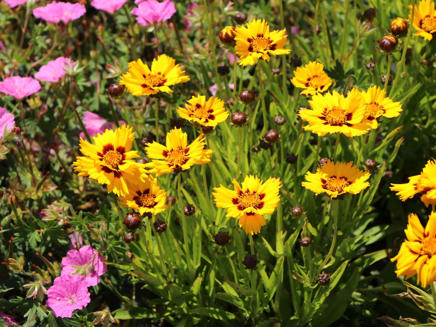 Das Großblumige Mädchenauge 'Andiamo Yellow with Red' präsentiert sich als wunderbar pflegeleichte und unkomplizierte Staude. Die Blüten von (bot.) Coreopsis grandiflora 'Andiamo Yellow with Red' strahlen über den ganzen Sommer durch den Garten. Satt goldgelbe Blüten sind das Markenzeichen des Großblumigen Mädchenauges 'Andiamo Yellow with Red'. Die Blüten wirken wie mit einer schmückenden Kette aus rotbraunen Perlen verziert. Dieser zierende Kranz legt sich dekorativ um die zentrale Blütenscheibe und bildet einen umwerfenden Anblick. Die an den Spitzen leicht eingeschnittenen Zungenblüten umgeben die Blütenmitte in gleichmäßiger Anordnung. Die Blütezeit des Großblumigen Mädchenauges 'Andiamo Yellow with Red' dauert von Juni bis in den späten Herbst hinein an. Bienen, Hummeln und auch andere kleine Insekten lassen sich nicht lange bitten, sie nutzen das reiche Angebot an Pollen und Nektar der herrlichen goldgelben Blüten.