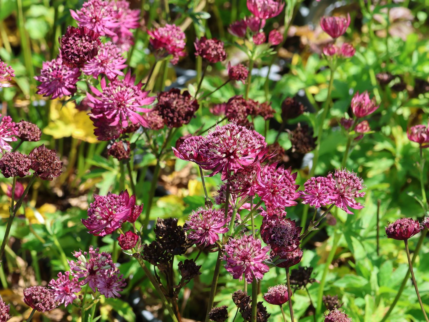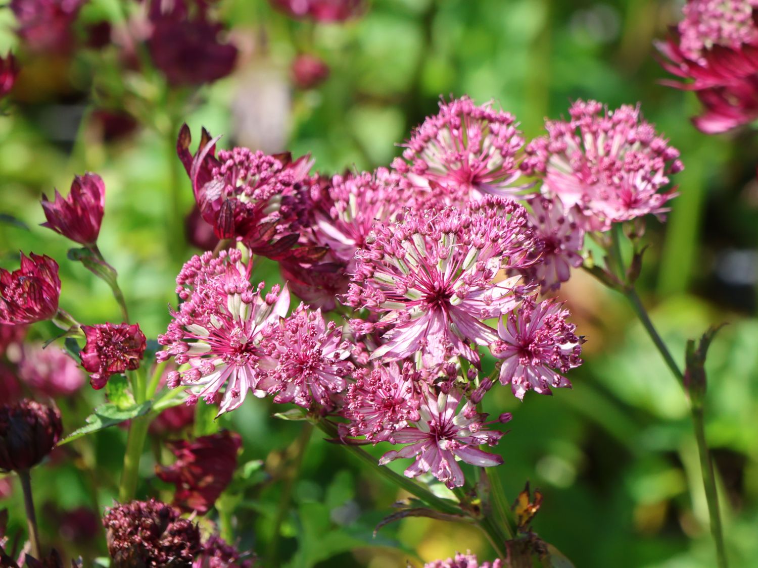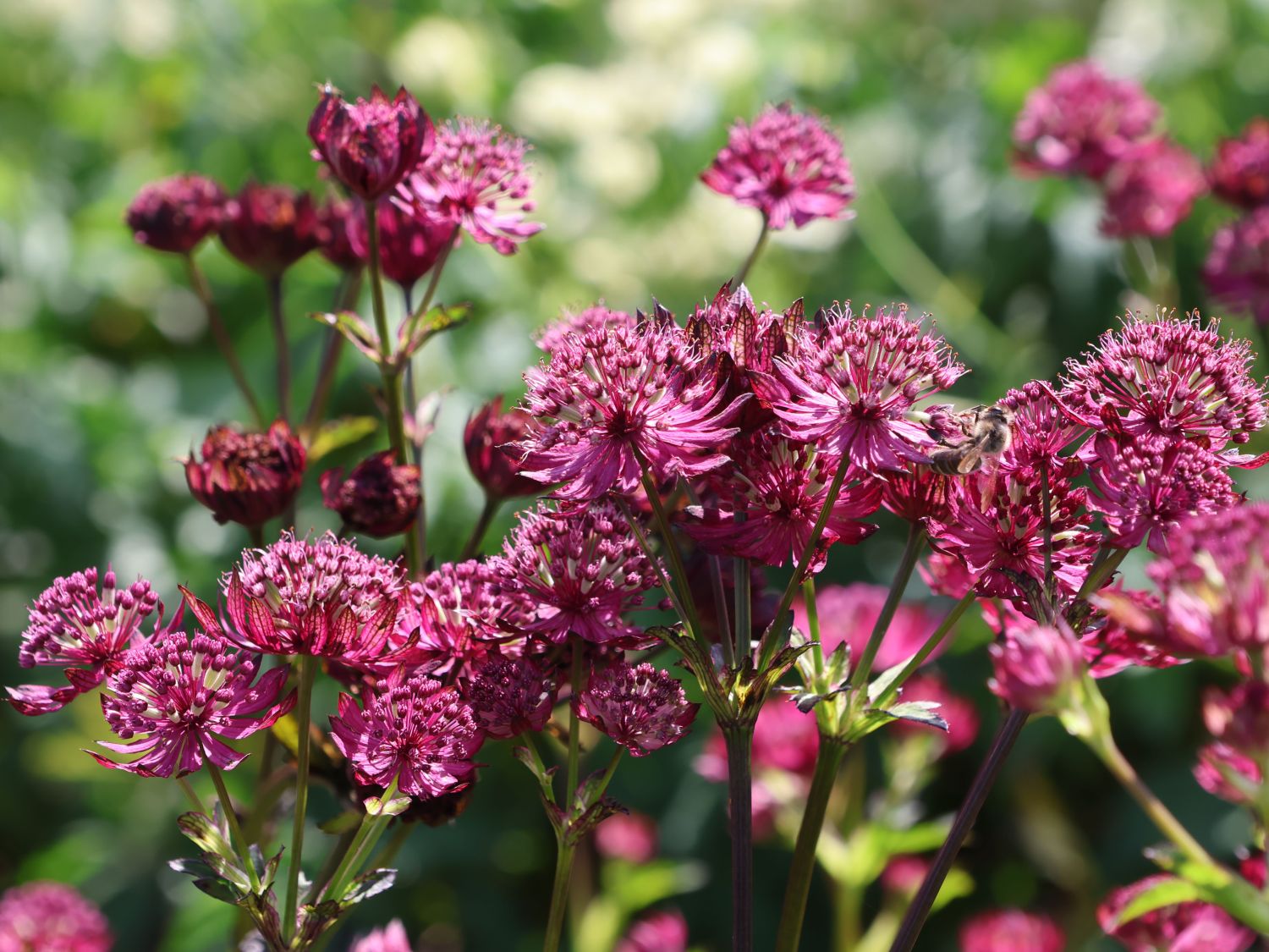 Sonnige bis halbschattige Pflanzorte entsprechen ideal den Lichtbedürfnissen dieser Staude. Besonders wohl fühlt sich die Große Sterndolde 'Sparkling Stars Red' an Standorten, die morgens oder am späten Nachmittag Sonne gewährleisten, und ihnen pralle Mittagshitze erspart bleibt. Unter diesen Lichtverhältnissen entfaltet die Staude langfristig ihr gesamtes gestalterisches Potenzial - vom vitalen Wuchs bis zur intensiven Blütenwirkung - sofern eine passende Bodenbeschaffenheit unterstützend bereitsteht. Diesbezüglich erweisen sich frische bis feuchte Böden als optimal, wenn diese gut durchlässig und nährstoffreich sind. Einen leicht sauren bis minimal kalkhaltigen pH-Wert benötigt (bot.) Astrantia major 'Sparkling Stars Red' für die bestmögliche Feuchtigkeits- und Nährstoffaufnahme der Wurzeln. Einen passenden Standort belohnt die Staude mit einem unkomplizierten und schnell erledigten Pflegeaufwand. Eine organische Düngergabe im Frühjahr ist in der Regel ausreichend, um den Boden wieder anzureichern. Während längerer Trockenperioden empfiehlt sich, mit einem Gießen einer zu starken Bodenaustrocknung entgegenzuwirken, da dies zur Beeinträchtigung vor allem der Blütenansätze führen kann. Verblühte Dolden schneiden erfahrene Gärtner ab, damit die Pflanze mehr Energie in die bestehenden und die Neubildung investiert. Frühestens im Spätwinter entfernt man die abgestorbenen Pflanzenteile aus der Vorsaison. Bis dahin nutzen sie kleineren Gartengästen als Schutzraum vor Fressfeinden und Kälte. Selbst strenge Winter mit Tiefstwerten um -23 °C bringen die Große Sterndolde 'Sparkling Stars Red' nicht aus dem Gleichgewicht, was sie zu einer sicheren Wahl für exponierte Standorte macht. Lediglich bei Kübelpflanzungen empfiehlt sich ein zusätzlicher Schutz des Wurzelbereichs, um Frostschäden zu vermeiden.