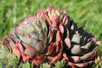 Die Hauswurz 'Lipari' ist nicht nur für Sukkulentenfreunde ein herrliches Exemplar ihrer Gattung, sondern auch für Einsteiger im Sukkulentengarten. Dieser kann Teil eines Steingartens sein, sich auf einem Dach, einer Mauerkrone oder einer Trockenmauer befinden und auf Totholz, alten Baumwurzeln und in Pflanzgefäßen aller Art zur Verschönerung von Balkon, Terrasse oder Garten angelegt werden, und das ganz ohne aufwendige Pflege und große gärtnerische Zuwendung. Sempervivum x cultorum 'Lipari' ist immergrün, robust, mehrjährig sowie trockenheits- und kälteverträglich mit einer kompletten Winterhärte bis -34° C. Die schöne Hauswurz zeichnet sich durch einen kompakten Wuchs in intensiv farbigen Rosetten aus, von denen sich im Laufe der Zeit seitlich der Hauptpflanze immer neue bilden. Besonders markant ist die Farbe dieser Hauswurz, ein intensives Weinrot, das an den Rändern der dickfleischigen Blätter und in der Mitte in ein frisches Grün übergehen und sich im Laufe des Sommers immer wieder leicht zu verschiedenen Rot- und Grüntönen verändern kann. Die Hauswurz blüht im Juni und Juli ausgesprochen ansehnlich. Dann bilden sich in den Rosetten Blütenstängel mit zahlreichen, hellgelben bis rosafarbene Sternenblüten, welche die Pflanze überragen. Die leicht duftenden Blüten verlocken Bienen, Hummeln und Schwebfliegen zur Landung. Die Hauswurz 'Lipari' begnügt sich mit kargen Standorten. Der Boden kann trocken, sandig bis lehmig und nur mäßig nährstoffreich sein. Was sie allerdings gar nicht verträgt, ist Staunässe. Deshalb sollte vor allem in Pflanzgefäße eine Drainage aus Blähton oder Kies eingearbeitet werden. Die Hauswurz bevorzugt einen vollsonnigen Standort, kommt aber auch in halbschattigen Lagen auf ihre Kosten. Sie erreicht bei einem jährlichen Zuwachs von maximal zwei Zentimetern Höhen um die 10 bis 15 Zentimeter und Breiten von 15 Zentimetern.