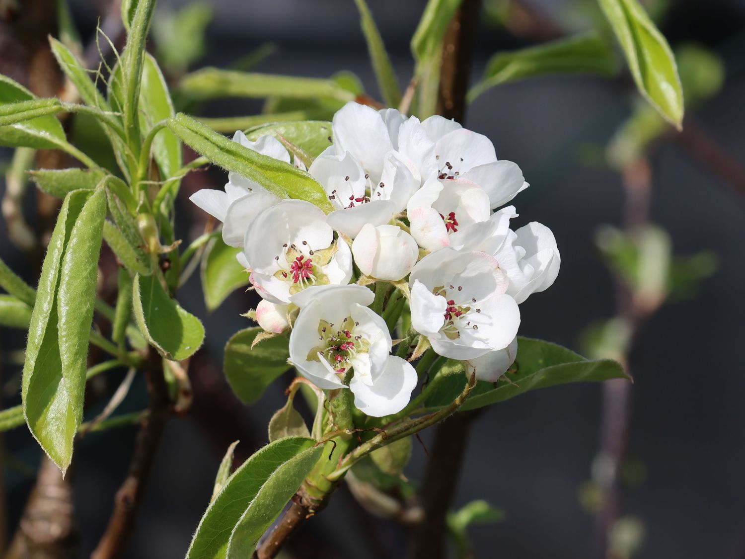 Die Herbstbirne 'Harrow Sweet' stammt aus der Versuchsstation in Harrow (Ontario) in Kanada. Die Eltern dieser Birnensorte sind 'Williams Christ' x 'Purdue 80-51'. Diese nordamerikanische Sorte ist in unseren Breiten wenig anzutreffen. Das Obstgehölz ist winterhart und unkompliziert. Pyrus communis 'Harrow Sweet' punktet mit ihren herrlichen Früchten. Die Birnen schmecken aromatisch-süß. Ihr Fruchtfleisch ist cremeweiß, herrlich saftig und zartschmelzend. Typisch für diese Sorte ist die kelchbauchige Form der großen Frucht. Die Schale ist leuchtend gelb. Sie weist zahlreiche Rostpunkte auf und ist sonnenseits leicht rosa angehaucht oder gerötet. Die Herbstbirne 'Harrow Sweet' ist eine mittelstark wachsende Sorte. Sie wird zwischen drei und fünf Meter hoch. Die Breite beträgt bis zu 350 Zentimeter. Die Birne ist eine beliebte Nasch- und Tafelfrucht und eine hervorragende Wahl für den Hausgarten. Die Frucht ist für einen längeren Zeitraum im Kühlhaus lagerfähig. Im April bis in den Mai blüht die Herbstbirne 'Harrow Sweet'. Dann hüllt sie sich in ein zauberhaftes weißes Blütenkleid. Die einzelnen Blüten besitzen eine ovale Form. Kaum kann es der Pflanzenfreund abwarten, bis er die köstlichen Früchte ernten und genießen kann. Nach der Blüte entwickelt der Baum viele Früchte.