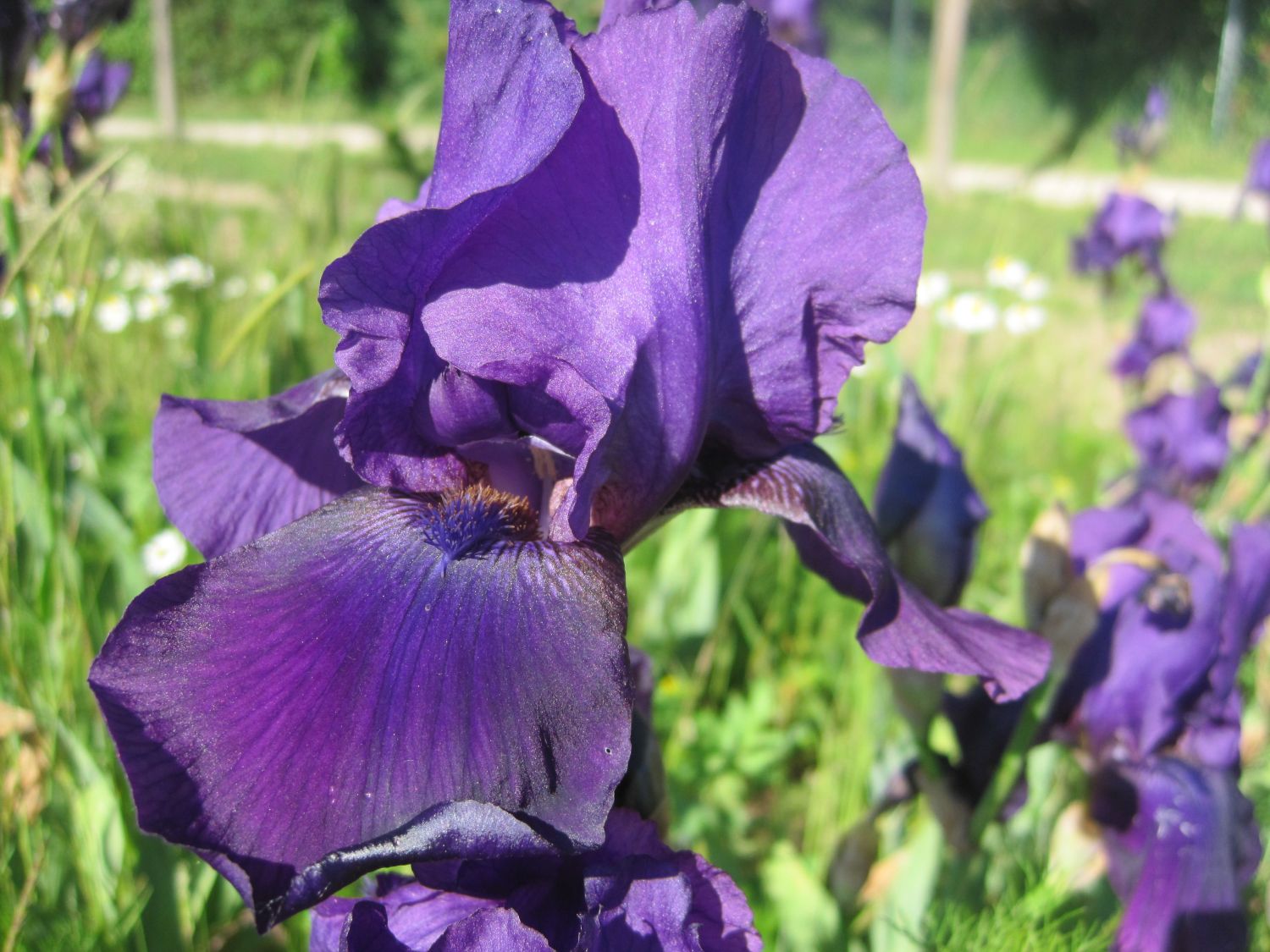 Die Hohe Bart-Iris 'After Dark' gehört zur Familie der Schwertliliengewächse (Iridaceae). Diese markante Staude stammt vom Züchter Schreiner (USA) aus dem Jahr 1963. 'After Dark' ist bekannt für ihre auffälligen, satten violettblauen Blüten, die eine besondere Eleganz und Dramatik in den Garten bringen. Die Pflanze wächst aufrecht und erreicht eine Höhe von etwa 60 bis 80 Zentimetern. Sie bildet rhizomartige Wurzeln, die sich horizontal unter der Erde ausbreiten. Das Laub ist schwertförmig, steif und bläulich-grün, mit einer wachsartigen Oberfläche. Die Blätter werden bis zu 40 Zentimetern lang und bleiben auch nach der Blütezeit attraktiv. Die kelchförmigen Blüten von (bot.) Iris x barbata-elatior 'After Dark' sind groß, üppig und haben eine samtige Textur. Sie erscheinen zahlreich von Mai bis Juni, wobei jede Blüte nur für wenige Tage geöffnet ist. Die Farbe ist ein tiefes, sattes Violett, das je nach Lichteinfall variiert und manchmal einen leicht metallischen Schimmer aufweist. Die Domblätter sind gegenüber den Hängeblättern leicht aufgehellt. Für eine reichhaltige Blüte benötigt die Hohe Bart-Iris 'After Dark' einen sonnigen Standort mit ungefähr sechs Stunden direkter Sonne pro Tag. Sie bevorzugt einen gut durchlässigen, frischen Boden, der reich an organischem Material ist. Ein leicht alkalischer pH-Wert ist ideal.