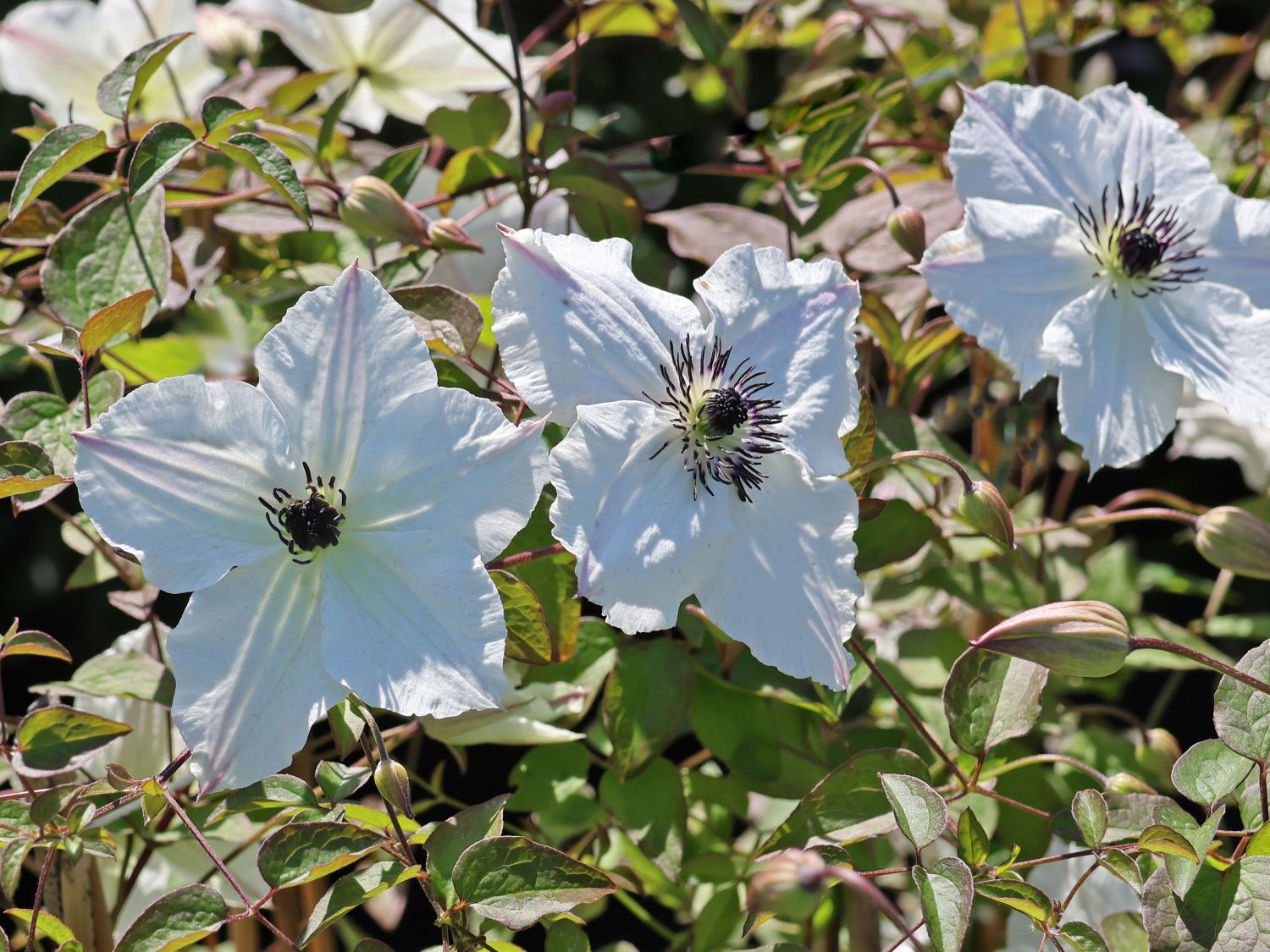 Die Italienische Waldrebe 'Sunny Side' ist eine wunderschöne Neuheit aus der großen Gruppe der beliebten und gesunden Viticella-Sorten. Diese schöne Pflanze wächst auf 150 bis 200 cm Größe heran. Mit ihrem rankenden Wuchsverhalten ist sie als Kleinstrauch einzuordnen. Unter guten Voraussetzungen wächst (bot.) Clematis viticella 'Sunny Side' auf eine Breite von 50 bis 100 cm heran. Die sommergrünen Blätter der Italienischen Waldrebe 'Sunny Side' sind gegenständig an den Trieben angeordnet, ganzrandig und mittelgrün. In der Zeit von Juni bis September zeigt diese eindrucksvolle Clematis ihre zauberhaften Blüten. Diese sind glockenförmig und beeindrucken mit reinweißen Blütenblättern, die einen zarten rosa Streifen aufweisen. Einen zauberhaften Kontrast bieten die dunklen Staubblätter in der Mitte der Blüten.