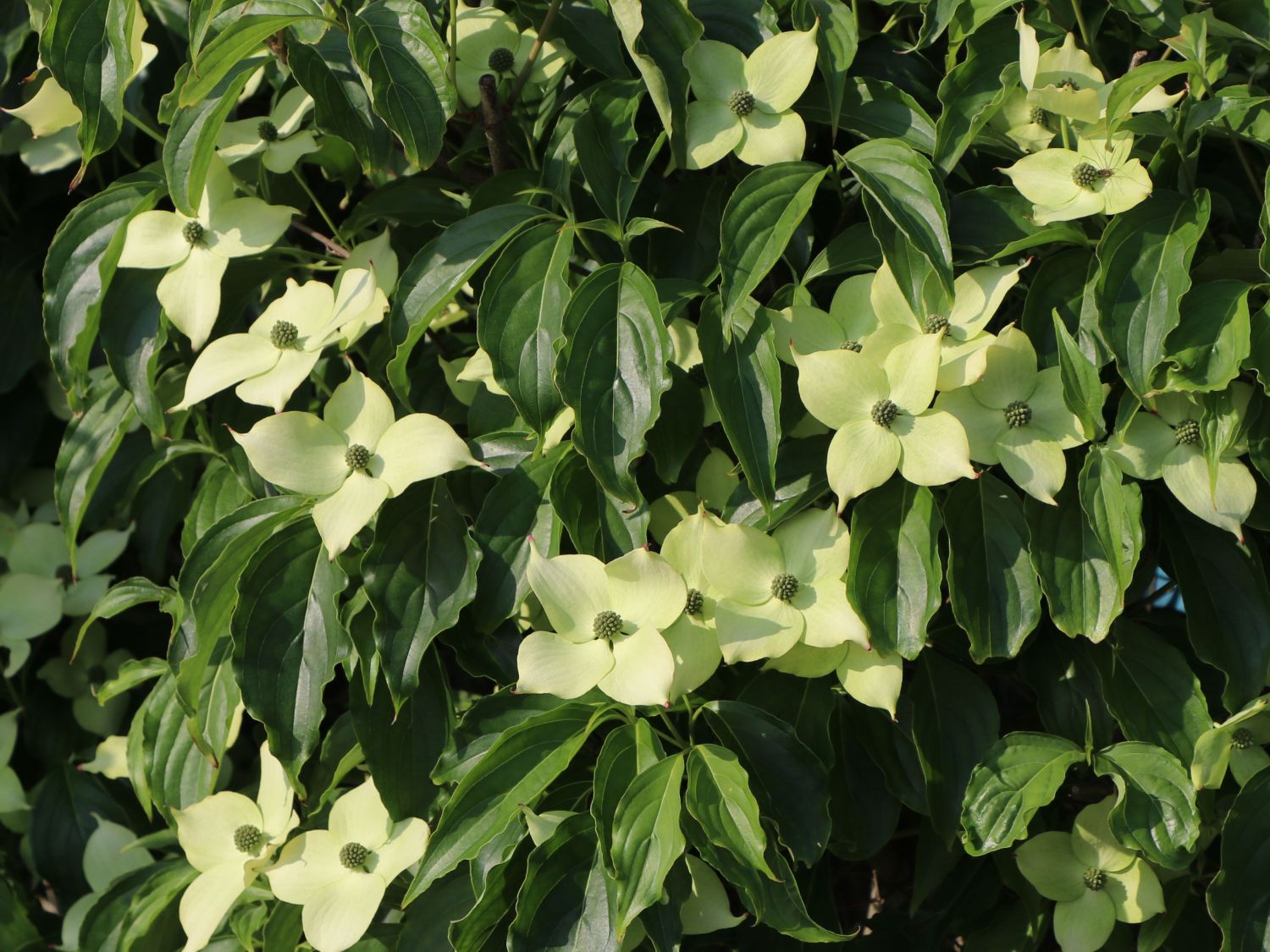 Der Japanische Blumen-Hartriegel 'Angyo Dwarf' gehört botanisch zur Ordnung der Hartriegelartigen, den Cornales sowie in die Familie der Hartriegelgewächse, den Cornaceae. Etwa vierzig Arten gehören zu dieser Gattung und Cornus kousa ist eine dieser Arten. Diese schöne Pflanz entwickelt sich zum größeren Strauch oder zum kleinen Baum. Die Urform strebt in ihrem natürlichen Umfeld bis zu zehn Meter in die Höhe. Dieser niedliche Gartenbewohner entwickelt sich auf eine Höhe von bis zu zwei Metern. Seine oberen Äste stehen senkrecht, während die unteren Äste waagerecht abstehen. Dadurch ergibt sich die eiförmige Gestalt des Baumes. Auch die Laubblätter sind eiförmig, ganzrandig und gegenständig angeordnet. Typisch für diese Cornusarten sind die vier Hochblätter. Sie umgeben eine Dolde aus bis zu vierzig kleinen grünen Blüten. Die einzelnen Steinfrüchte vereinen sich zu einer rot-orangen Scheinfrucht. Die Früchte sind essbar. Cornus kousa wächst bevorzugt auf feuchten, gut durchlässigen Böden an Waldrändern oder Flussufern. Als Zierbaum ist er seit langem kultiviert und zur Begrünung von Straßen im Einsatz.