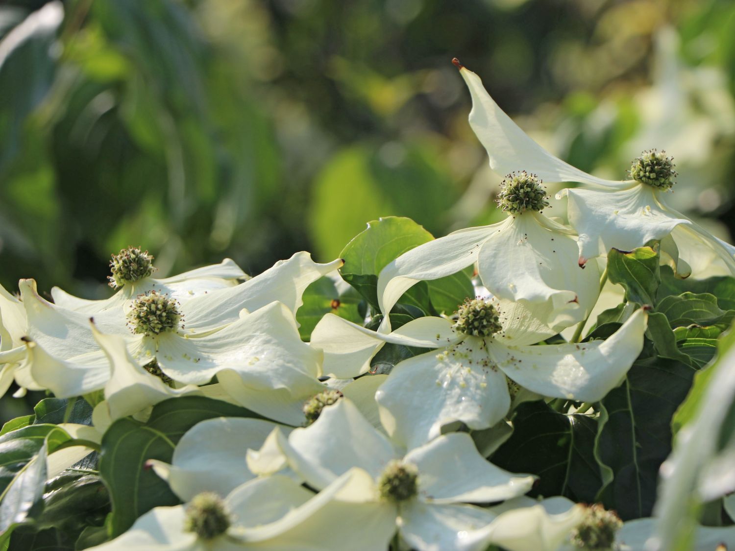 Zu den schönsten Gehölzen seiner Art zählt der Japanische Blumen-Hartriegel 'Cherokee'. Er gehört zur Familie der Hartriegelgewächse. Dieser sommergrüne Großstrauch oder Kleinbaum hat seine Heimat in den Bergwäldern Japans und Korea. Er wächst straff aufrecht und entwickelt mit den Jahren eine breite Krone. Seine unteren Zweige sind etagenförmig angeordnet.