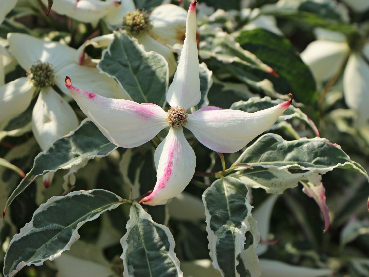 Dieses Schmuckstück bezaubert mit einer weißer Blütenpracht, silbrig-grün panaschierten Blättern, spektakulärer Herbstfärbung und roten Früchten. Diese Attribute flankieren den Japanischen Blumen-Hartriegel 'Kim', einen gern gesehenen Dauergast in jedem kreativen Ziergarten. Der Blütenstrauch begeistert von Mai bis Juni mit einem Meer aus strahlend weißen Hochblättern, die sich um grüne Blütenköpfchen versammeln. Eindrucksvoll kontrastieren die silbern und grün marmorierten Blätter, die auch nach der Blühphase für florale Glücksmomente sorgen. Im Spätsommer und Herbst setzt sich das Farbenspiel fort mit rot-gelben Blättern, über denen rosarote Früchte thronen.