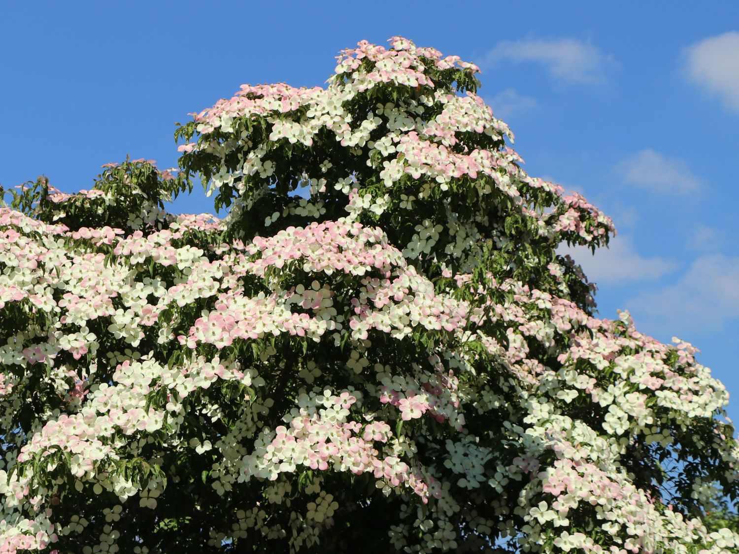 Der Japanische Blumen-Hartriegel 'Norman Haddon' ist eine aparte Variante der weißblühenden Cornus-kousa-Sorten. Es handelt sich um eine Züchtung aus Cornus kousa und Cornus capitata. Dieses Grüngehölz ist halb-wintergrün. In milderen Wintern bleibt ein Teil des Laubes an dem Strauch hängen. Cornus kousa 'Haddon' ist eine Neuzüchtung, die noch wenig in unseren Gärten anzutreffen ist. Das Blütengehölz ist eine botanische Rarität und punktet mit seinen zweifarbigen Blüten. Diese sind beim Austrieb zunächst cremeweiß. Sie nehmen nach und nach eine zarte Rosafärbung an. Nur der Blattanfang bleibt weiß. Die wie Blüten wirkenden Hochblätter sind rundlich und mit einem spitzen Blattende. Sie überlappen sich und bilden einen fantastischen Blickfang im Frühling. 'Norman Haddon' blüht rund sechs Wochen lang von Mai bis in den Juni. Die grünlich-gelbe Blütendolde im Zentrum der Scheinblüten hebt sich vom Weiß-Rosé der großen Blüten farblich schön ab. Jedes Blütenblatt dieses Zierstrauches ist von großer Ausdruckskraft und begeistert den Pflanzenliebhaber. Das baumartige Blühwunder wird bis zu fünf Meter hoch und ebenso breit. Die Zierpflanze wächst langsam und ist aufgrund ihrer ausladenden Wuchsform und der Blütenfülle ein großartiger Solitär.