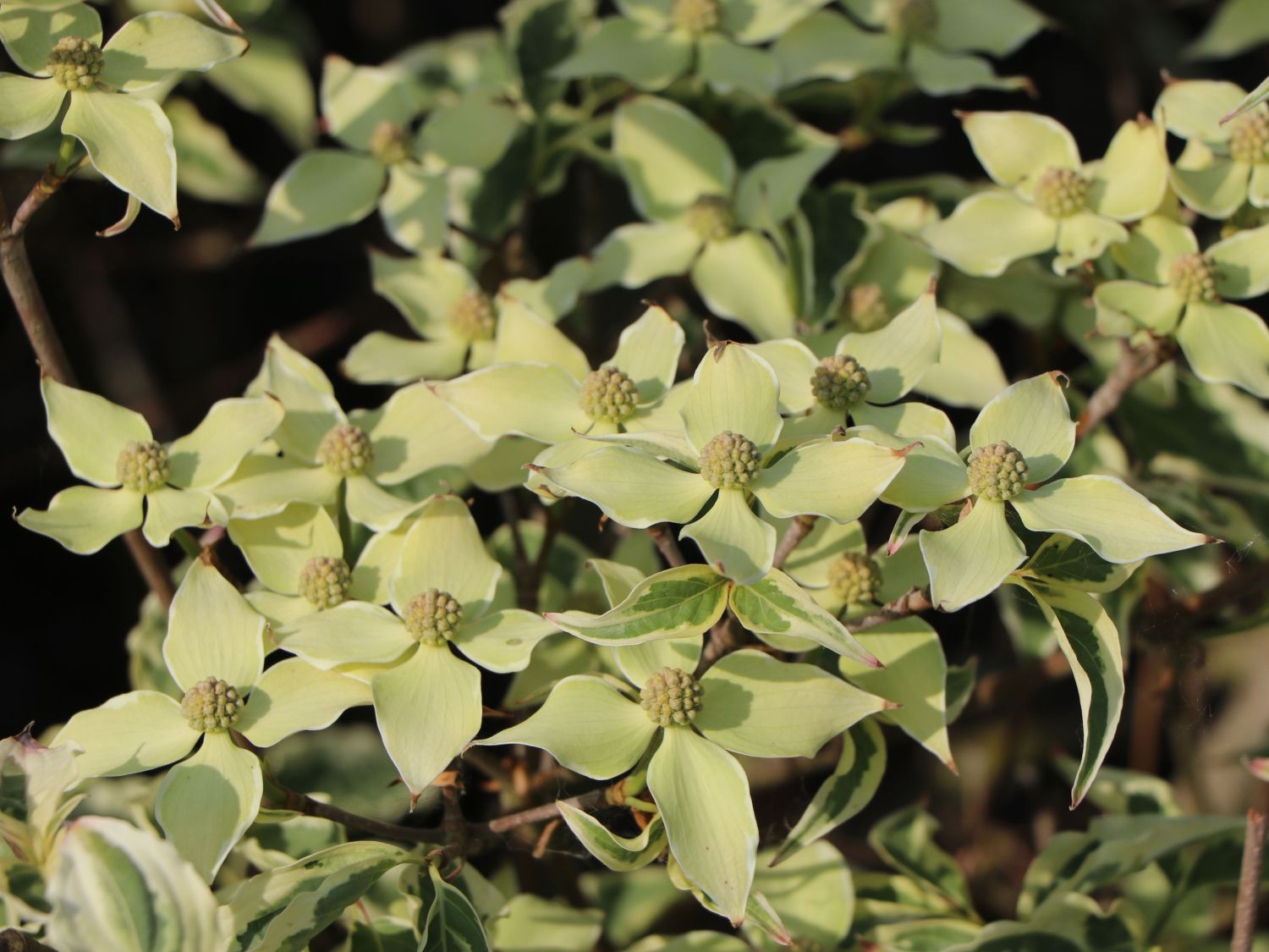 Der Japanische Blumen-Hartriegel 'Peve Limbo' bietet im Frühjahr einige Überraschungen. Beim Austrieb zeigen die Blätter eine gelblich-grüne Färbung. Auch mit den Blüten geizt er nicht. Zudem ist (bot.) Cornus kousa 'Peve Limbo' auch hier veränderlich. Anfangs noch grünweiß, fließt die weiße Farbe vom Rand immer mehr in das Hochblatt. Obwohl die weißen Hochblätter vergleichsweise klein sind, wirkt der Baum durch die Vielzahl dieser Blumen wie von Schnee bestäubt. Der Anblick ist einfach bezaubernd. Die hochstehenden runden Blütendolden im Zentrum der vier Hochblätter bekommen im Lauf des Sommers eine leicht rosa Farbe. Aus den einzelnen Blüten entwickeln sich kleine Steinfrüchte, die sich zu einer kugeligen Scheinfrucht vereinen. Von weitem wirkt die leuchtend rote Frucht wie eine Himbeere. Dieser Fruchtschmuck bleibt wochenlang am Baum. Im Herbst legt der Japanische Blumen-Hartriegel 'Peve Limbo' seine Zurückhaltung ab und leuchtet in Purpurrot und Violett. Im Winter zeigt der Hartriegel mit seiner grauen, bei älteren Ästen wie gesprenkelt wirkenden Rinde ein schönes grafisches Muster. Nach der botanischen Einordnung gehört der Japanische Blumen-Hartriegel in die Familie der Hartriegelgewächse, den Cornaceae und damit zur Pflanzengattung der Hartriegel. Ursprünglich wächst Cornus kousa in Japan, Korea, China und Taiwan auf feuchten Böden. Wegen der dekorativen Wirkung seiner Blüten, ist Cornus kousa seit langer Zeit eine beliebte Pflanze zur weiteren Zucht. Die Sorte Cornus kousa 'Peve Limbo' ist eine Auslese aus den Niederlanden. Piet Vergeldt stellte sie im Jahr 1999 vor. Seit 2002 ist sie im Handel erhältlich. Bisher ist der Baum noch nicht oft in Privatgärten oder öffentlichen Anlagen anzutreffen.
