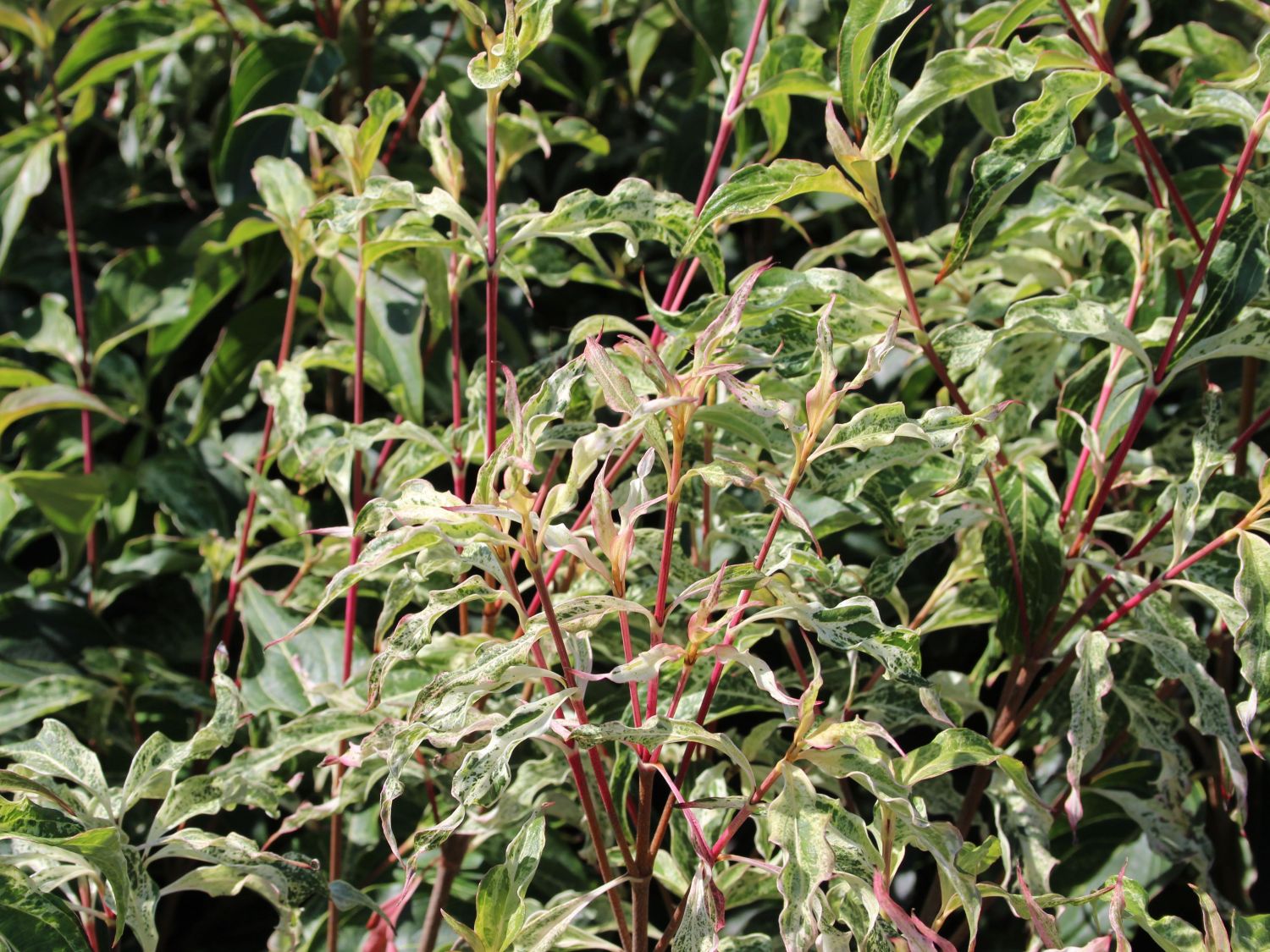 Das Außergewöhnliche an Cornus kousa 'Pink Lips' ist die Form der Blätter. Schmal, spitz zulaufend und teils gedreht bis verdreht, so zeigen sich das wunderschön gefärbte Laub. Die Kolorierung ist das wahre Highlight der Blätter, mittelgrün, mit creme weißen und rosafarbenen ungleichmäßigen Flecken wirken sie wie gemalt. Diese ungewöhnliche Färbung macht dem Namen des Japanischer Blumen-Hartriegel 'Pink Lips' alle Ehre. Wie rosabemalte Lippen wirken die zarten und malerischen Blätter. Auch die jungen Triebe der Pflanzen weisen eine rosafarbene Tönung auf. Nach der Blütezeit bildet die Pflanze erdbeerähnliche Früchte aus. Als würde die Blüte mit ihren rosafarbigen Akzenten bereits auf die wunderschönen Früchte aufmerksam machen wollen. Das Laubwerk färbt sich in der Herbstzeit wunderschön ein. Rötliche Akzente versetzen den Strauch in einen umwerfenden herbstlichen Mantel. Nach der Verfärbung fallen die Blätter nach und nach ab, da die Pflanze zu den laufabwerfenden Gehölzen gehört.