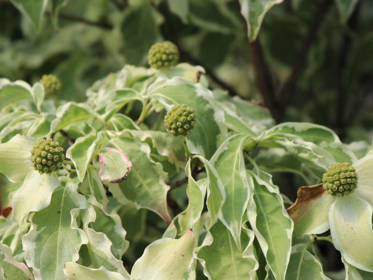 Der Japanische Blumen-Hartriegel 'Snow Boy' ist eine exklusive Sorte unter den Hartriegelgewächsen. Dieses extravagante Blütengehölz besticht mit seinem locker aufrechten Wuchs und seinen grün-weiß panaschierten Blättern. Untermalt wird die Attraktivität dieser Pflanze noch einmal mehr mit den wunderschönen, reinweißen Blüten. Faszinierend zu beobachten ist bei dem Japanischen Blumen-Hartriegel, dass Blüte und Blatt sich in der Formgebung sehr ähneln, was typisch für die Hartriegelgewächse ist. Der Cornus kousa 'Snow Boy', so der botanische Name der Pflanze, besticht nicht nur durch seine Blüten mit den vier weißen Hochblättern, sondern auch durch sein schönes, panaschiertes Laub. Die mittelgrünen Blätter haben einen breiten weißen Rand und verfärben sich im Herbst in rosa bis rot. Locker aufrecht ist das Wuchsverhalten des Japanischer Blumen-Hartriegel 'Snow Boy', mit dem er sich im Garten repräsentativ in Szene setzt. Er erreicht in der Höhe Ausmaße um die 150 bis 250 Zentimeter. Als schöner, kompakter Strauch wächst die Pflanze heran und bildet sich nach und nach breit und schön aus. Zwischen einem bis 1,5 Meter erreicht das Laubgehölz in der Breite an Ausmaß.