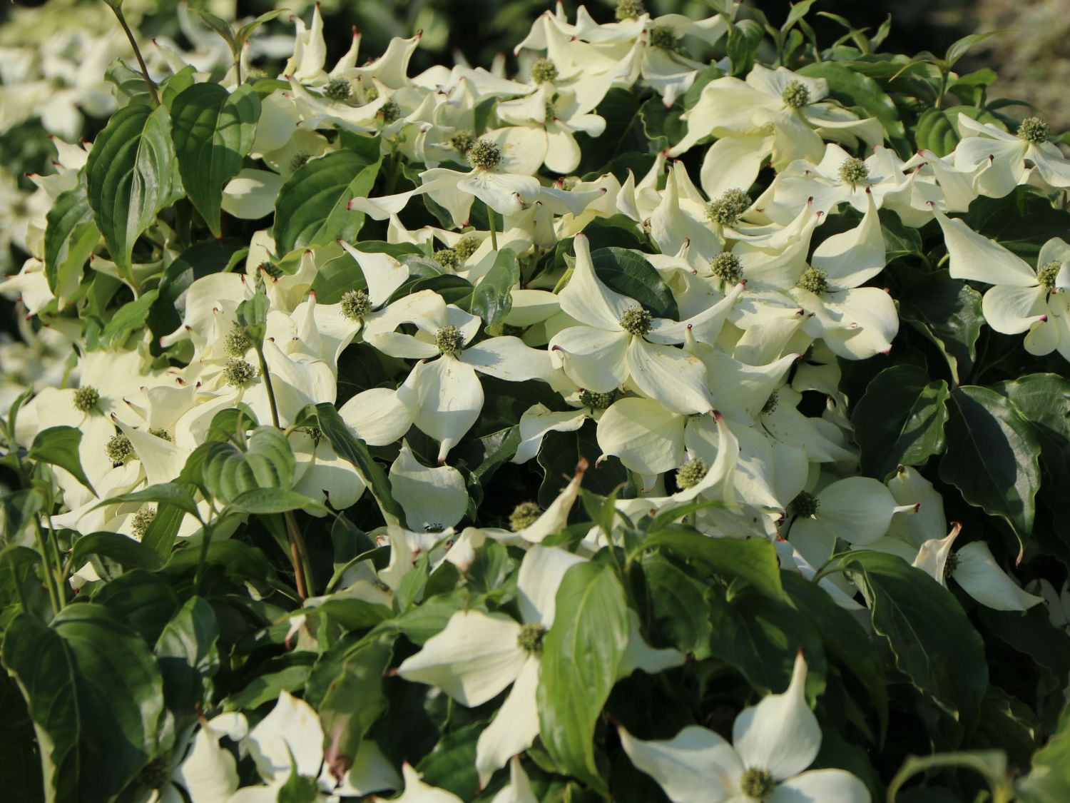 Der Cornus kousa 'Snowflake' ist dreimal im Jahr ein optisches und kulinarisches Highlight im Garten. Die wunderschöne Färbung des Herbstlaubes ist zu spektakulär, um sie zu übersehen. Dieser Blütenstrauch ist eine prächtige Wunderkiste, die einen Garten dreifach verwandelt. Im Frühjahr mit zauberhaft reinweißen Blüten, im Spätsommer mit reifen, himbeerartigen Früchten und durch das farbenfrohe Herbstlaub, das den Indian Summer in den eigenen Garten holt. Obwohl der Japanische Blumen-Hartriegel 'Snowflake' zarte weiße Blüten hervorbringt, ist er ein winterharter Strauch, der klirrenden Nachtfrost ohne Schutzmaßnahmen übersteht. Zudem braucht er wenig Pflege und stellt keine großartigen Ansprüche an die Bodenbeschaffenheit. Er verträgt keine andauernde Trockenheit und Staunässe ist am Pflanzort nachteilig. Der Cornus kousa 'Snowflake' freut sich über einen durchlässigen, leicht sauren Boden mit ausreichend Nährstoffen. Auf diese Weise bringt der Asiatische Blüten-Hartriegel seine überreiche Blütenpracht zur Entfaltung und später viele Früchte hervor. Der Japanische Blumen-Hartriegel 'Snowflake' wächst langsam. Allerdings erreicht er nach zehn Jahren eine stattliche Größe von etwa 250 cm. Das macht eine Einzelstellung erforderlich. Da seine Größe auf ein übersichtliches Maß begrenzt bleibt, ist er für einen Vorgarten oder für kleinere Gärten geeignet. Auch an begrenzten Wirkungsorten entfaltet er seine Blütenpracht. Er darf in Kübeln auf der Terrasse oder dem Grillplatz stehen oder im Hintergrund eines Staudenbeetes die Aufmerksamkeit auf sich ziehen.