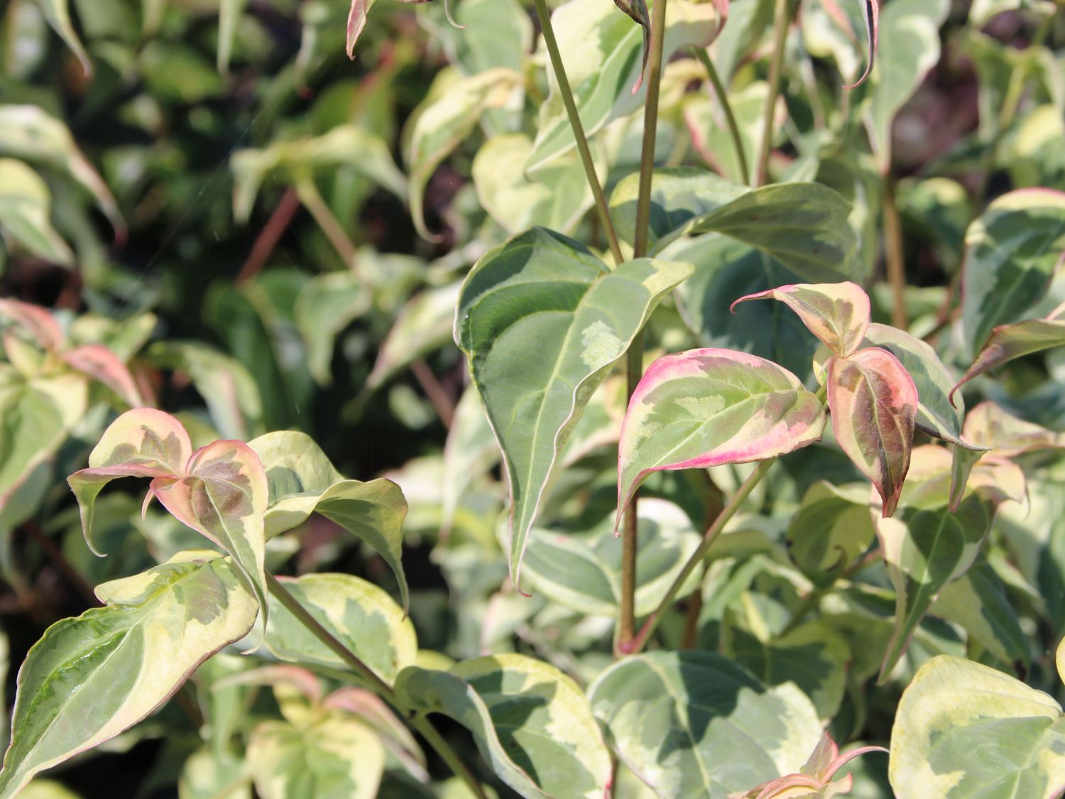 Das Laub steht bei dieser Sorte klar im Fokus. Es spielt mit verschiedenen Farben. Mittig zeigt es sich dunkelgrün und am Rand erscheint ein starker, ungleichmäßiger Streifen in Cremeweiß. Kaum ein anderer Hartriegel zeigt solche Facetten auf seinen Blättern wie der Japanische Blumen-Hartriegel 'Willy Boy'. Die Blattspreiten sind oval und zeigen sich leicht wellig. Die Blätter laufen an ihrer Spitze elegant zu. Das absolute Highlight ist, wenn sich Cornus kousa 'Willy Boy' im Herbst nach und nach verfärbt. Dann sorgt der Zierstrauch im Garten für ein wahres Aufleuchten, das von Weitem ein absoluter Blickfang ist. Die Herbstfarbe der Blätter sucht ihresgleichen! Das cremefarbige und grüne Laubwerk verfärbt sich an der dunkelgrünen Stelle in ein dunkles Rot bis Bordeaux. An den hellen Rändern zeigt es sich rosarot bis pink. Vereinzelt verbleiben Farbkleckse in sommerlichem Grün auf den Blättern. Ein wunderschönes Feuerwerk der Farben im herbstlichen Garten! Nach der ausgeprägten Herbstfarbe wirft Strauch sein Laubwerk nach und nach ab und geht in die Winterpause. Im Frühjahr treibt die Pflanze verlässlich aus und präsentiert aufs Neue ihr Facettenreichtum. Mag das Laubkleid prächtig sein, Blüte des Japanischen Blumen-Hartriegels 'Willy Boy' ist nicht minder beeindrucken. In der Zeit von Mai bis Juni bilden sich cremeweiße bis weiße Hochblätter aus. Sie haben eine attraktive Form und strahlen dem Betrachter aus der Ferne entgegen. Wie beim Cornus üblich, handelt es sich bei den auffälligen Hochblättern nicht um die eigentliche Blüte. Diese ist unscheinbar und sitzt zu mehreren in kugeligen Blütenständen zusammen. Vereinzelt bilden sich aus den Blüten bis zum Herbst himbeerartige Früchte, die essbar sind und einen exotischen Geschmack haben. Durch die gelartige Konsistenz des Fruchtfleischs spielen sie im Obstanbau keine Rolle. Cornus kousa 'Willy Boy' begeistert den Gärtner mit seiner Wuchsform. Diese entfaltet er langsamen und erreicht im Alter bis zu drei Meter Wuchshöhe. Damit ist dieser kompakte Strauch für kleine Gärten geeignet. Auch auf größeren Flächen macht er mit seinem hübschen Laub auf sich aufmerksam. In Gruppen präsentiert er sich als harmonisches Element des Ensembles. Den Kombinationen mit diesem Laubgehölz sind keine Grenzen gesetzt. Diese Hartriegel-Sorte setzt lebendige und farbenfrohe Akzente in jedes Arrangement.