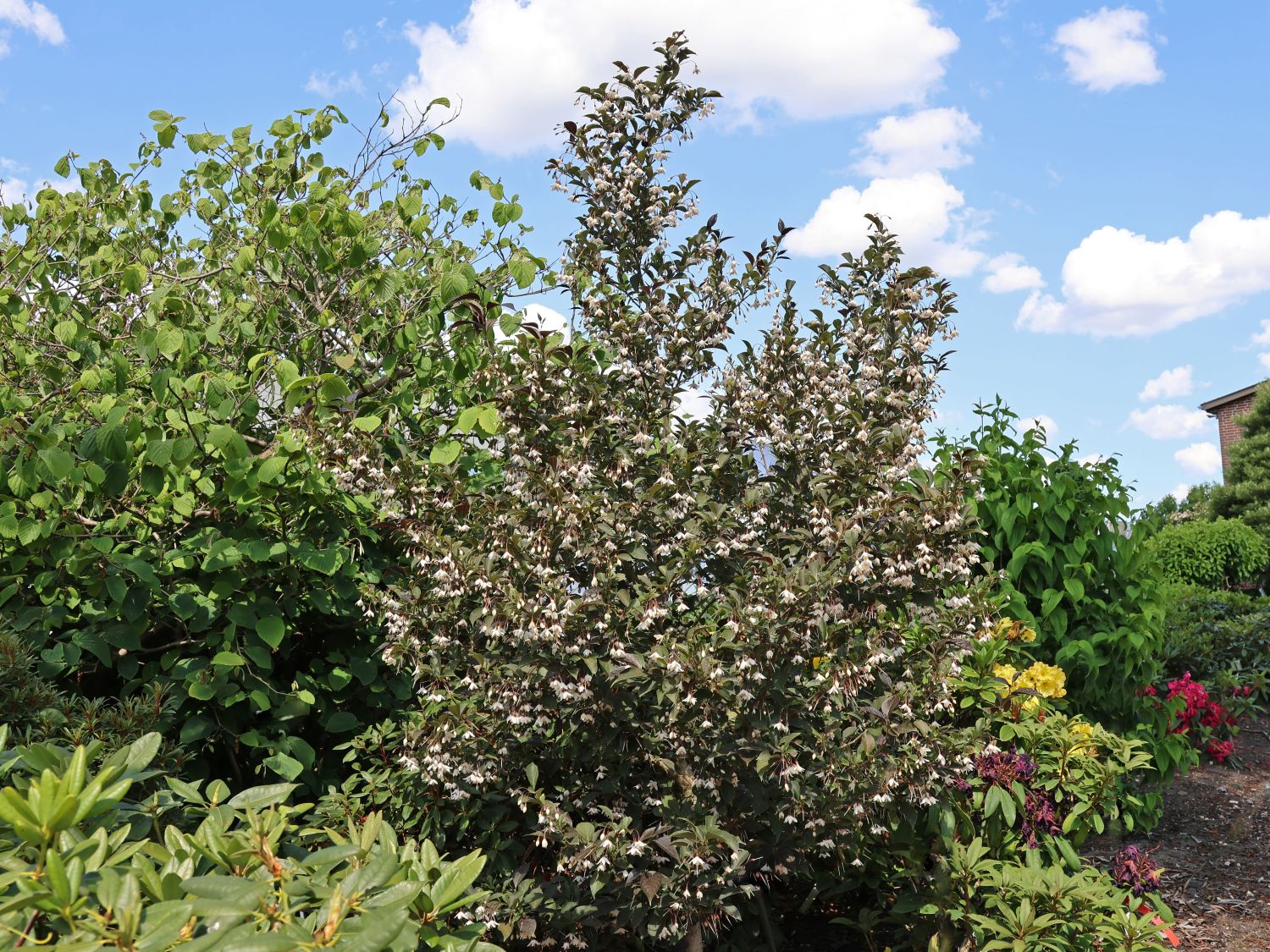 Japanischer Storaxbaum 'Evening Light', auch Japanischer Schneeglöckchenbaum genannt, fällt durch sein dunkelpurpurnes Laub und ein traumhaftes Glockenspiel reinweißer Blüten besonders ins Auge. Er gehört zur Familie der Storaxbaumgewächse (Styracaceae) und stammt in der Artform aus den Wäldern Japans. Die Sorte wurde vom niederländischen Züchter Henny Kolster als Zufallssämling selektiert. Der Wuchs ist zunächst vasenförmig aufrecht, später breitkronig und reich verzweigt mit seitlich abstehenden Ästen und locker überhängenden Zweigen. An optimalen Standorten erreicht (bot.) Styrax japonica 'Evening Light' eine Höhe von etwa 4 bis 8 Metern und 3 bis 8 Metern Breite. Die Zuwachsrate liegt moderat bei rund 20 bis 30 Zentimetern pro Jahr. Die Rinde ist grau bis graubraun, relativ glatt bis leicht gefurcht. Sie bildet mit den fein verzweigten, purpurn bis graubraun gefärbten Zweigen eine elegante Wintersilhouette. Das Laub treibt im Frühling rotviolett bis dunkelpurpurn aus, verfärbt sich im Sommer zu einem tief dunkelpupurnen bis schwarzgrünen Glanz und kann in etwas schattigeren Lagen auch olivgrüne Töne annehmen. Die elliptisch bis eiförmigen, ganzrandigen, zugespitzten Blätter sitzen wechselständig und bilden durch den dunklen Ton einen ruhigen Hintergrund für die Blüte. Im Herbst zeigt Japanischer Storaxbaum 'Evening Light' eine intensive purpurrote bis violettrote Färbung. Von Juni bis Juli hängen unter den Zweigen zahlreiche glockenförmige Blüten in lockeren Trauben. Sie sind reinweiß mit einer goldgelben Mitte und gelben Staubblättern, angenehm zart duftend und haben oft rötlich getönte Blütenstiele. Der starke Hell-Dunkel-Kontrast zwischen Blüte und Laub gibt dem Gehölz eine sehr edle, beinahe leuchtende Wirkung. Im Spätsommer folgen attraktive, ovale, olivgrüne bis cremeweiße Steinfrüchte, die Vögeln als Nahrung dienen. Bevorzugt werden sonnige bis halbschattige, windgeschützte Standorte mit durchlässigem, humosem, frischem bis feuchtem, nährstoffreichem und eher kalkarmem, leicht saurem Boden.