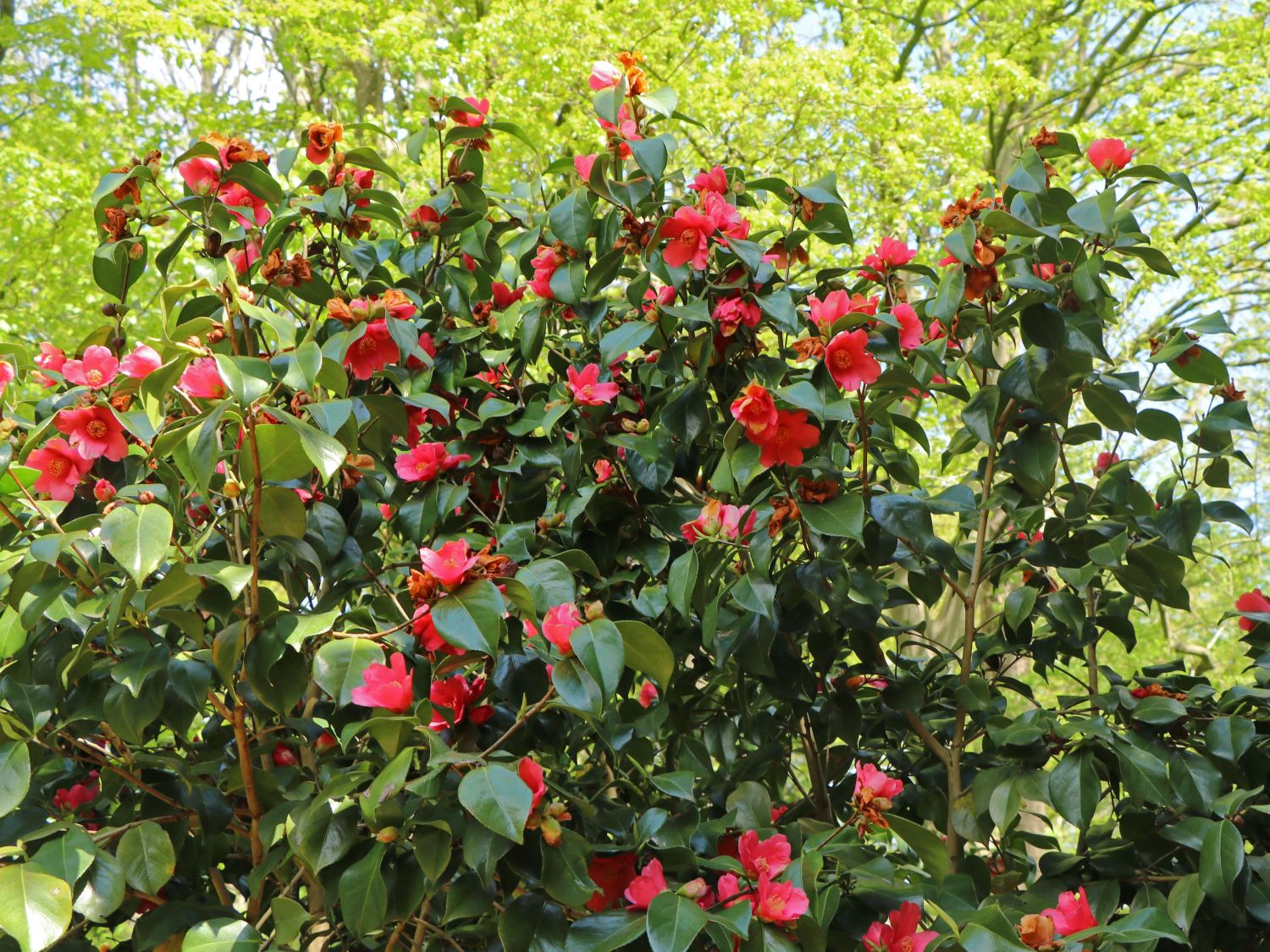 Die Kamelie 'Adolphe Audusson' ist eine wunderschöne, gut winterharte Pflanze und im Kameliengarten bestens geeignet. Mit einer ausgezeichneten Winterhärte von bis zu -18°C zählt diese Züchtung aus dem Jahr 1941 des Amerikaners F. M. Uyematsu, der als "König der Kamelien" bezeichnet wurde, zu den kältetolerantesten Kamelien. Camellia 'Adolphe Audusson' zeichnet sich durch vielzählige Blüten und eine lange Blütezeit aus. Die glutroten, halb gefüllten und herrlich leuchtenden Blüten mit Durchmessern teilweise über zehn Zentimetern sind mindestens so schön wie Rosenblüten, denn nicht zufällig werden Kamelien auch als "Rosen des Winters" bezeichnet. Bemerkenswert ist an der Blüte der aparte Kontrast zu den tiefgelben Staubblättern in der Blütenmitte, die von den meist 12 leicht abgerundeten Blütenblättern in drei Reihen umrahmt werden. Einen ebenfalls interessanten Kontrast zu den Blüten bietet das Laub mit seinen glänzenden, dunkelgrünen, leicht gezackten ovalen Blättern, die spitz zulaufen. Unter guten Bedingungen blüht Kamelie 'Adolphe Audusson' zuverlässig. Sie setzt im Laufe des Frühjahrs und Sommers bis in den Herbst hinein immer wieder dicke runde Knospen an. Die kompakten Knospen für die nächste Blüte ab Februar oder März werden schon im Spätsommer und Herbst angesetzt. Sie reifen bei Temperaturen zwischen null und zehn Grad Celsius. Bei zu warmen Temperaturen fallen die Knospen ab. Der immergrüne Strauch wächst in halbschattigen Lagen und in feuchtem, leicht saurem und humusreichem Boden von Natur aus kräftig und kompakt. Im Beet sollte die Kamelie im Winter mit einem Vlies oder Schattiernetz vor der Sonne geschützt werden. Im Sommer benötigt sie einen hellen, aber halbschattigen Platz ohne direkte Sonneneinstrahlung vor allem um die Mittagsstunden, da die Blätter sonst verbrennen. In der Vor- und Nachmittagszeit steht die Kamelie hingegen gern besonnt. Sie kann beispielsweise im lichten Schatten von Bäumen, an Mauerrändern und gern auch in der Nähe von Teichen oder fließenden Gewässer gepflanzt werden.