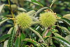 Die edle Kastanie 'Klon 90044' bereichert heimische Gärten durch ihren hohen Zierwert und ist ein Lieferant für gesunde und schmackhafte Esskastanien, die als Maronen bezeichnet werden. Das ursprüngliche Herkunftsgebiet der Edelkastanie ist der Mittelmeerraum, insbesondere Spanien, Portugal und Italien. Seit längerer Zeit gibt es jedoch schon größere Vorkommen jenseits der Alpen in etwas wärmeren Regionen, beispielsweise am Neckar. Vereinzelte Bäume trifft man inzwischen selbst in der Mitte und im Norden Deutschlands an. Castanea sativa 'Klon 90044' ist eine robuste Züchtung, die mit dem Klima hierzulande gut zurechtkommt. Als junger Baum sollte die Edelkastanie die ersten drei bis vier Jahre noch mit einem leichten Winterschutz versehen werden. Als etablierter Baum zeichnet sie sich durch eine Winterhärte bis -20°C aus. Die Edelkastanie mit ihrer eher nüchternen Sortenbezeichnung bevorzugt einen sonnigen sowie geschützten Standort und einen frischen bis feuchten, gut durchlässigen, normalen, humosen, leicht sauren bis neutralen Gartenboden. In trockenen Perioden sollte die Kastanie regelmäßig mit Wasser versorgt werden. Sie ist ansonsten recht anspruchslos und entwickelt sich zu einem stattlichen Baum und Schattenspender, der im Frühjahr, Sommer und Herbst einen herrlichen Anblick bietet. Im Frühling, wenn die Kastanie 'Klon 90044' männliche, bis zu 25 Zentimeter lange Blütenkätzchen, gefolgt von hübschen, cremig weiße, weiblichen Sternenblüten in schuppigen Fruchtbechern bildet und betörend duftet, ist sie ein ausgezeichnetes Bienennährgehölz. Im Sommer bieten die grün glänzenden, oval zugespitzten, gezähnten, äußerst aparten Blätter einen erfrischenden Anblick. Im Herbst schließlich gibt die Edelkastanie noch einmal alles, um das Auge zu erfreuen. Die Herbstfärbung ist leuchtend gelb und die stacheligen Fruchthüllen geben nach und nach ihren delikaten Inhalt frei, an dem sich gern auch Vögel und kleine Säugetiere, wie Krähen, Eichhörnchen und Igel, laben. Man sollte sich mit dem Aufsammeln der bis zu drei Zentimeter großen, aromatischen Nussfrüchte, die bis in den März hinein lagerfähig sind, deshalb besser beeilen.