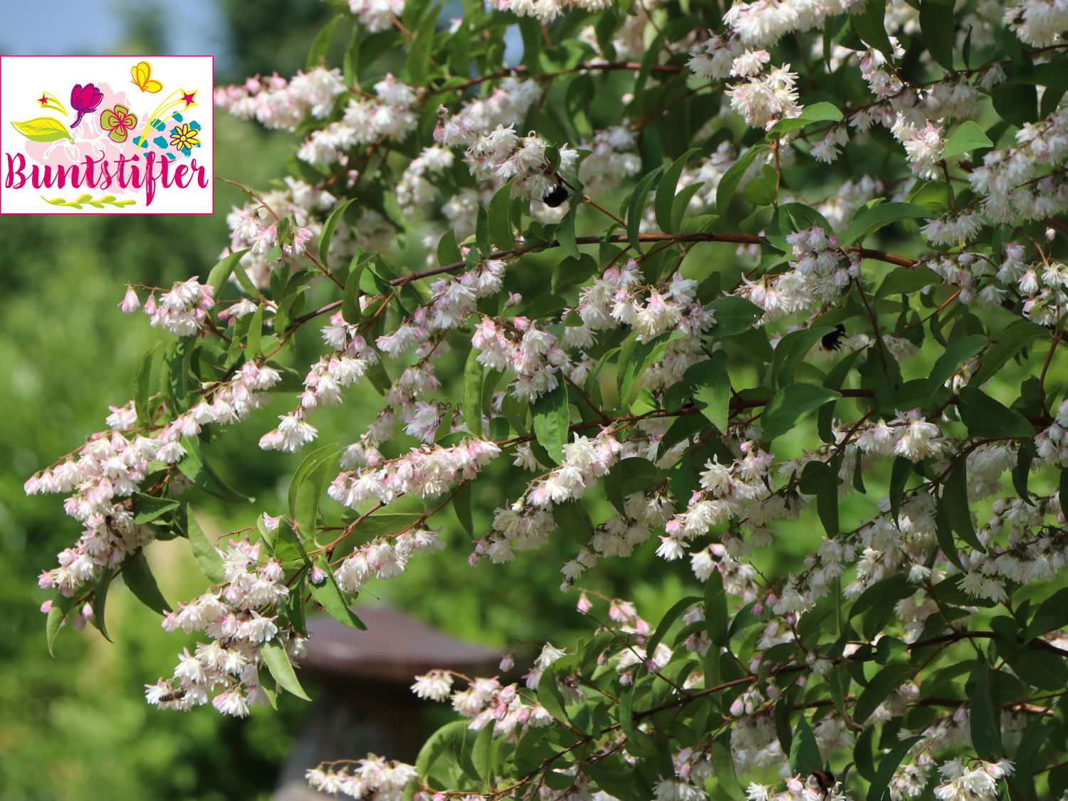 Der Maiblumen-Strauch / Gefüllter Sternchenstrauch Buntstifter 'Plena' ist mit seinem reichen Flor und dem dekorativen Laub eine Zierde in jedem Garten. Von Juni bis Juli verwöhnt er das Auge mit seiner Blütenpracht. Die kleinen, zierlichen Blüten sitzen in üppigen Rispen zusammen und sind dicht gefüllt. Sie präsentieren sich in reinem Weiß. Außen sind sie mit einem zarten Rosaton angehaucht. Auch außerhalb ihrer Blütezeit ist (bot.) Deutzia scabra Buntstifter 'Plena' ein attraktiver Blickfang. Ihre ansehnlichen Blätter sind eiförmig, vorn zugespitzt und rau. Mit ihrem intensiven Dunkelgrün bilden sie einen tollen Kontrast zu den hellen Blüten und heben deren Strahlkraft noch hervor. Im Herbst nehmen sie einen rötlichen Farbton an. Der Maiblumen-Strauch / Gefüllter Sternchenstrauch Buntstifter 'Plena' wächst straff aufrecht und dicht. Im Alter hängen seine Zweige anmutig über. Er erreicht eine Höhe von 250 bis 350 Zentimetern. Seine Breite beträgt 180 bis 250 Zentimeter. Der Zierstrauch zeichnet sich durch einen raschen Wuchs aus, jedes Jahr legt er 30 bis 80 Zentimeter zu.