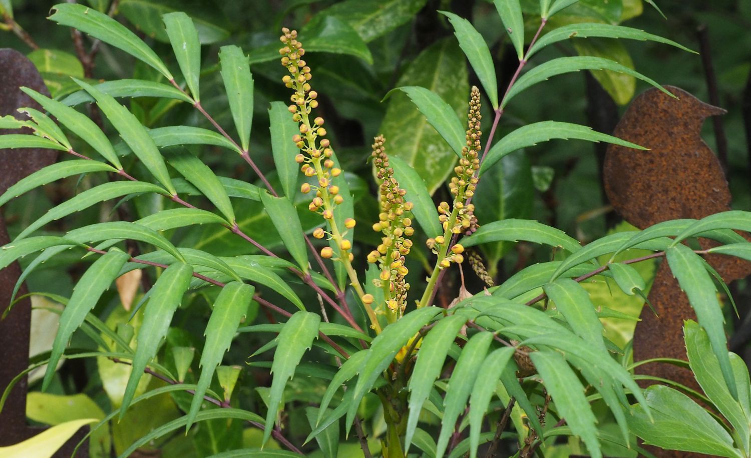 Die Oregon-Traube 'Volcano', 'MYOY' wächst zu einem aufrechten, buschigen und kompakten Strauch heran, der sich mit immergrünen Blättchen schmückt, die ganzjährig an den Trieben verbleiben. Die schmal-lanzettlichen Blätter von (bot.) Mahonia aquifolium 'Volcano', 'MYOY' sind von Stacheln bezahnt und in einem glänzenden Dunkelgrün gehalten. Das Laub unterteilt sich in diese Blätter und in die dichten Trauben rotbrauner Knospen. Die Knospen öffnen sich im späten Sommer zu Blüten in schönstem Goldgelb. Im weiteren Verlauf verändern sich die Blüten der Oregon-Traube 'Volcano', 'MYOY' im Herbst zu blauschwarzen kugeligen Früchten.