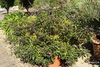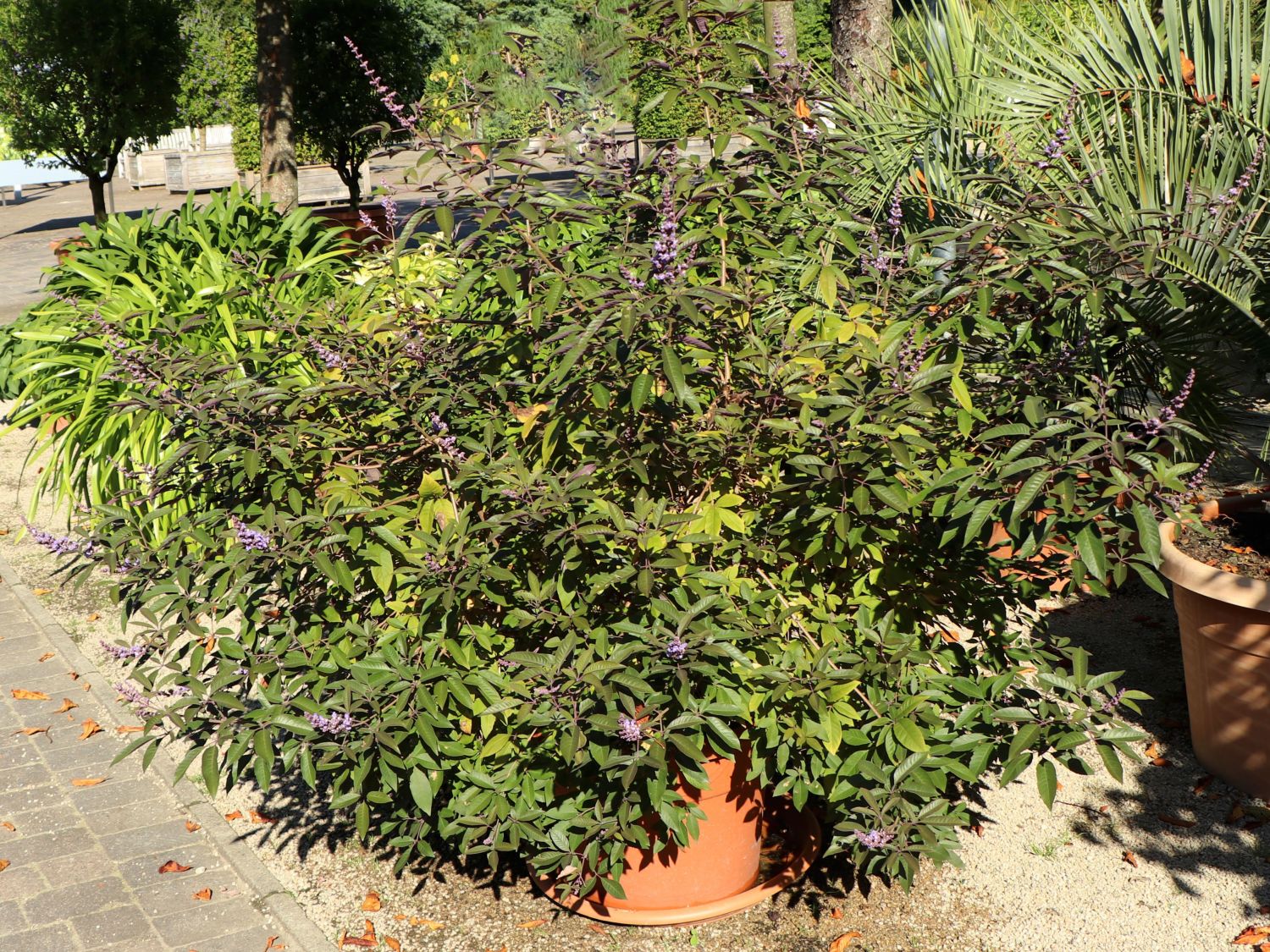 Der Purpur-Mönchspfeffer 'Purpurea' ist ein in sehr milden Regionen halb- bis immergrüner Strauch oder Baum der sich schnell zu seiner vollen Höhe und Breite von 3,0 bis 4,5 m entwickelt. Auffallend sind die Blätter, die sich teilweise in drei elliptisch geformte Blättchen unterteilen. Oberseits erscheinen die Blätter von (bot.) Vitex trifolia 'Purpurea' graugrün, unterseits sind sie einem samtigen Purpur gefärbt. Wer die Blätter zwischen den Fingern zerreibt, nimmt einen pfeffrigen Geruch wahr. In kälteren Regionen verliert das schöne Ziergehölz über den Winter sein Laub. Das ist aber nicht weiter schlimm, in zeitigen Frühjahr entwickelt sich erneut ein wunderschönes Blätterkleid. Im Sommer erscheinen die zarten, lavendelblauen Blütenrispen an den Triebspitzen. Sie setzen sich aus einer Vielzahl kleiner Einzelblüten zusammen und bilden eine imposante Länge von bis zu 25 cm. Der Purpur-Mönchspfeffer 'Purpurea' ist auch als Arabischer Flieder bekannt. Dieser Name bezieht sich auf die optische Ähnlichkeit mit dem bekannten Flieder, die allerdings botanisch unbegründet ist.