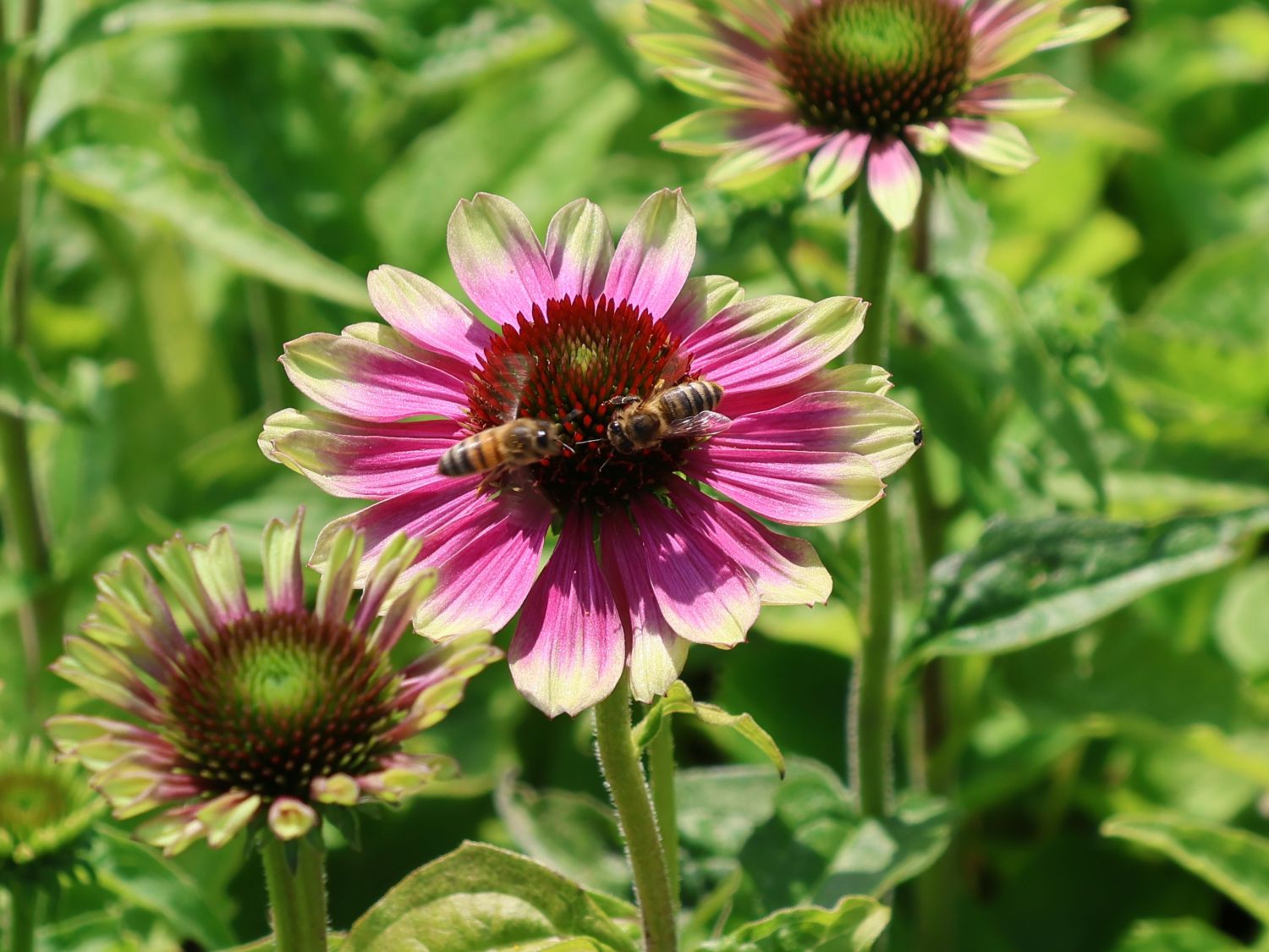 Der Purpur-Sonnenhut 'Prairie Blaze Vintage Lime' fällt dank der außergewöhnlich bunten Farbkombination seiner dicht wachsenden Blüten in jedem Garten sofort auf. Aufgrund der Zartheit seiner Farben vermittelt er dennoch ein Gefühl der Ruhe und Entspannung. Mit einer Blütezeit von Juni bis September ist er ein wahrer Dauerblüher für den gesamten Sommer. Oft zeigt er selbst im Herbst noch vereinzelte Blüten, die mit ihrer außergewöhnlichen Farbkombination auch neben buntem Herbstlaub noch eine besondere Attraktion darstellen. Die wie eine große Einzelblüte aussehenden Blütenstände haben in der Mitte ein kegelförmig erhabenes Zentrum in dunklem Purpurviolett, das manchmal eine grüne Mitte zeigt. Dieses ist von einem Kranz aus gerade zur Seite stehenden schlanken und langen Blütenblättern umgeben. Diese sind zunächst gelbgrün und verfärben sich im Laufe der Blütezeit vom Ansatz her rosa. Die endgültige Blüte zeigt sich dann rosa mit grünen Spitzen. Die hellen Blütenstände heben sich hochattraktiv von dem dichten dunkelgrünen Laubbüschel der Echinacea purpurea 'Prairie Blaze Vintage Lime' (botanisch) ab. Sie stellen eine beliebte Nahrungsquelle für Insekten dar, die wertvolle Bestäuber wie Bienen, Hummeln, Schwebfliegen und Schmetterlinge in den Garten lockt. Ein kompakter Wuchs und eine gute Verzweigung machen die Pflanze zu einer idealen Dekoration für kleine Gärten und beengte Standorte. Außerdem eignet sich der Purpur-Sonnenhut 'Prairie Blaze Vintage Lime' sehr gut als Schnittblume für herrlich bunte Blumensträuße und Vasen mit einer für den Sommer ungewöhnlich frühlingshaft zarten Farbkombination. Er erfordert nur wenig Pflege, ist ungiftig und wird dennoch nur selten von Wildtieren angefressen, was ihn zu einer vorzüglichen Pflanze für Gartenbesitzer:innen mit Kleinkindern und wenig Zeit für die Gartenarbeit macht.