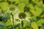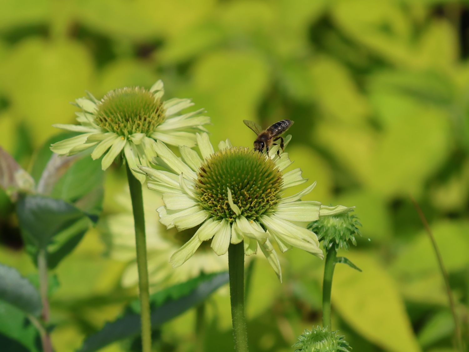 Der Purpur-Sonnenhut 'Verdana' ist eine herrlich buschige Staude mit prächtigen Blüten in einer auffälligen limonengrünen bis grünlich weißen Farbe, die im Garten alle Blicke auf sich zieht. Sein schönstes Aussehen zeigt er in der Blütezeit, die mit Mai bis Oktober den ganzen Sommer umfasst. Bei den wie eine einzelne Blume aussehenden körbchenförmigen Blüten handelt es sich genaugenommen um Blütenstände, die aus zwei unterschiedlichen Blütenarten bestehen. Sie bilden einen dichten grünen Kreis in der Blütenstandmitte, der von einer einzelnen Reihe von zunächst grünen schlanken und langen Blütenblättern umgeben ist. Diese hellen sich am Ansatz beginnend nach und nach zu einem cremigen Weiß auf, was der Echinacea purpurea 'Verdana' immer wieder neue Farbeindrücke verleiht. Trotz ihrem zarten Aussehen sind die Blütenblätter sehr stabil und halten auch plötzlichen Windstößen und Regengüssen gut Stand, weshalb die Pflanze häufig an exponierten Standorten und in windreichen Regionen gepflanzt wird. Ein weiterer Vorteil dabei ist der dicht verzweigte, buschige Wuchs des Purpur-Sonnenhuts, der mit seinen zahlreichen schmal lanzettlichen Blättern den kräftigen behaarten Stängeln zusätzlichen Windschutz bietet und die Pflanze gleichzeitig auch im Frühjahr vor Beginn der Blüte saftig grün und dekorativ aussehen lässt. Mit einer Wuchshöhe von 50 bis 60 cm und einer Breite von etwa 40 bis 50 cm eignet sich 'Verdana' vorzüglich als Solitärpflanze, die in der Rabatte oder im Vorgarten als zentraler Blickfang dient. Er sieht aber auch in Gruppenpflanzung im Staudenbeet oder in der Blumenwiese sehr gut aus und fühlt sich gedeiht gut in großen Pflanzkübeln auf Terrassen und Balkonen. Der Purpur-Sonnenhut 'Verdana' ist eine beliebte Schnittpflanze für Vasen und dient als Nahrungsquelle für nützliche Insekten wie Bienen, Schmetterlinge und Schwebfliegen. Zumeist findet man ihn in kleinen Gärten, Vorgärten und Bauerngärten. Auch die Nutzung in Naturgärten kommt vor, wobei jedoch zu beachten ist, dass er als aus den USA stammende Art in Mitteleuropa nur verwildert vorkommt.