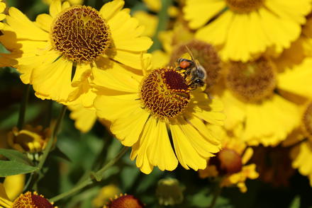 Viele Menschen tragen gerne Sorge dafür, dass im Garten, auf der Terrasse oder dem Balkon, zu fast jeder Zeit ein ausreichendes und kräftigendes Angebot für die Honigbienen zur Verfügung steht. Viele exotische Sträucher und Blumen wurden eingeführt aus fremden Ländern. Die meisten von ihnen sind, weil zumeist gefüllt blühend, wertlos für sie. Dagegen ist eine Sonnenblume im Garten die wahre Offenbarung. Diese anmutige und imposante Sommer-Grazie spendet Nährstoffe und Blütenstaub in Hülle und Fülle. Schmetterlinge umflattern sie, Hummeln ruhen sich auf ihr aus, und auch Schwebfliegen sowie Wildbienen werden zu einer reichhaltigen Mahlzeit eingeladen.