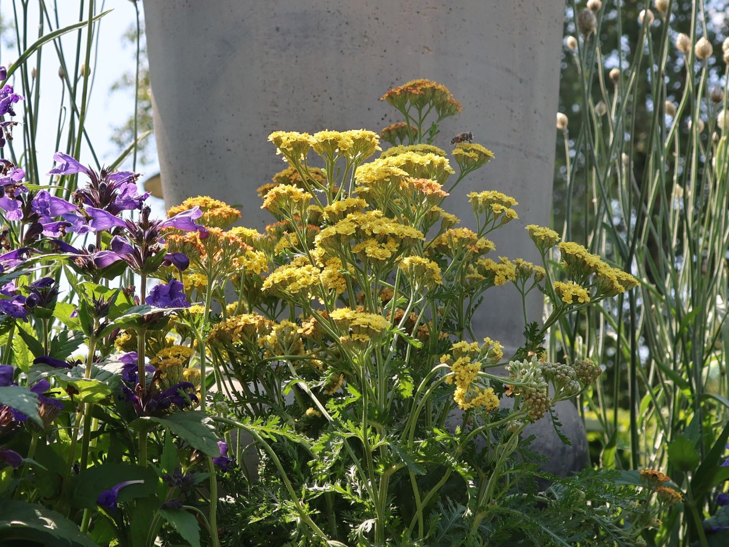 Die Schafgarbe 'Milly Rock Yellow Terracotta' aus der Familie der Korbblütler wächst als aufrechte, kompakte Staude. Ihr wissenschaftlicher Name 'Achillea' kommt aus der griechischen Mythologie, nach der Achilles die Schafgarbe mit in die Schlacht nahm, um damit seine Wunden zu behandeln. Im Garten ist (bot.) Achillea millefolium 'Milly Rock Yellow Terracotta' die perfekte Pflanze für Steingärten, Trockenbeete und als Schnittblume. Ihr mattes, tiefgrünes, gefiedertes Laub bildet wunderschöne Kontraste zu den leuchtend gelben bis terrakottafarbenen Blüten. Die zeigen sich von Juni bis August in Form angenehm duftender Dolden. Sie bestehen aus unzähligen kleinen Einzelblüten und vereinen jeweils gelbe und orangefarbene Farbtöne in sich. Diese Blütenvielfalt lässt sich gut mit dunkellaubigen Pflanzen sowie trockenheitsliebenden Stauden und Gräsern kombinieren. Das können beispielsweise andersfarbig blühende Arten der Schafgarbe sein. Auch neben Wilder Wegwarte, Wiesensalbei, Lavendel, Tag- oder Fackellilien setzt die Schafgarbe 'Milly Rock Yellow Terracotta' außergewöhnliche Akzente. Darüber hinaus eignet sie sich gut für Gruppenpflanzungen in kleineren Rabatten und für Beeteinfassungen. Da die überreiche Blüte den Pflanzen viel Kraft entzieht, lässt diese in der Regel nach einigen Jahren nach. Um dem entgegenzuwirken, sollten sie alle 2-3 Jahre geteilt und somit verjüngt werden. Dazu werden sie ausgegraben und mit dem Spaten in die gewünschte Anzahl an Teilstücken zerteilt. Dabei ist darauf zu achten, dass jedes neu gewonnene Teilstück über ausreichend Wurzeln verfügt, um anwachsen zu können. Vor dem Einpflanzen sollten schwache und abgestorbenen Wurzelteile und Triebe entfernt werden. Der richtige Zeitpunkt für eine Teilung und generell für die Pflanzung ist im Frühjahr nach dem Austrieb oder kurz nach der Blüte im Frühherbst.