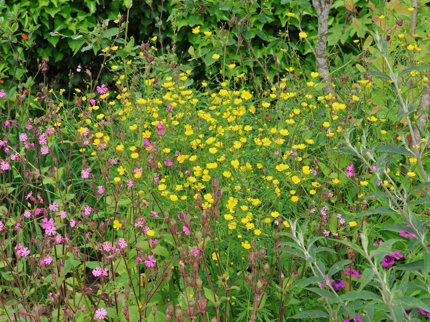 Den Scharfen Hahnenfuß kennen viele unter dem Namen Butterblume. Eine Bezeichnung, die treffender nicht sein könnte, denn die intensiv gelben und wachsartig glänzenden Blüten erinnern an Butter. Sie sind schalenförmig, erscheinen im Mai und stehen einzeln an langen, kahlen und runden Stielen. Die Blüten sind fünfzählig und werden etwa 2,5 Zentimeter groß. Obwohl sie kaum duften, üben sie mit ihrer leuchtenden Färbung auf Bienen, Hummeln und Schmetterlinge eine starke Anziehungskraft aus. Darum gilt Ranunculus acris auch als ökologisch wertvoll. Die krautige Staude kommt auf Wiesen und Weiden vor, wird aber von Weidetieren gemieden. Die Blätter haben eine handähnliche Form und sind tief eingeschnitten. Im unteren Bereich der Pflanze sind sie lang gestielt, doch je weiter oben sie sich befinden, desto kürzer sind die Stiele. Der Scharfe Hahnenfuß bildet nach der Blüte ab August oder September Sammelfrüchte aus, die aus unzähligen kahlen Einzelnüsschen bestehen und einen kleinen "Schnabel" besitzen.