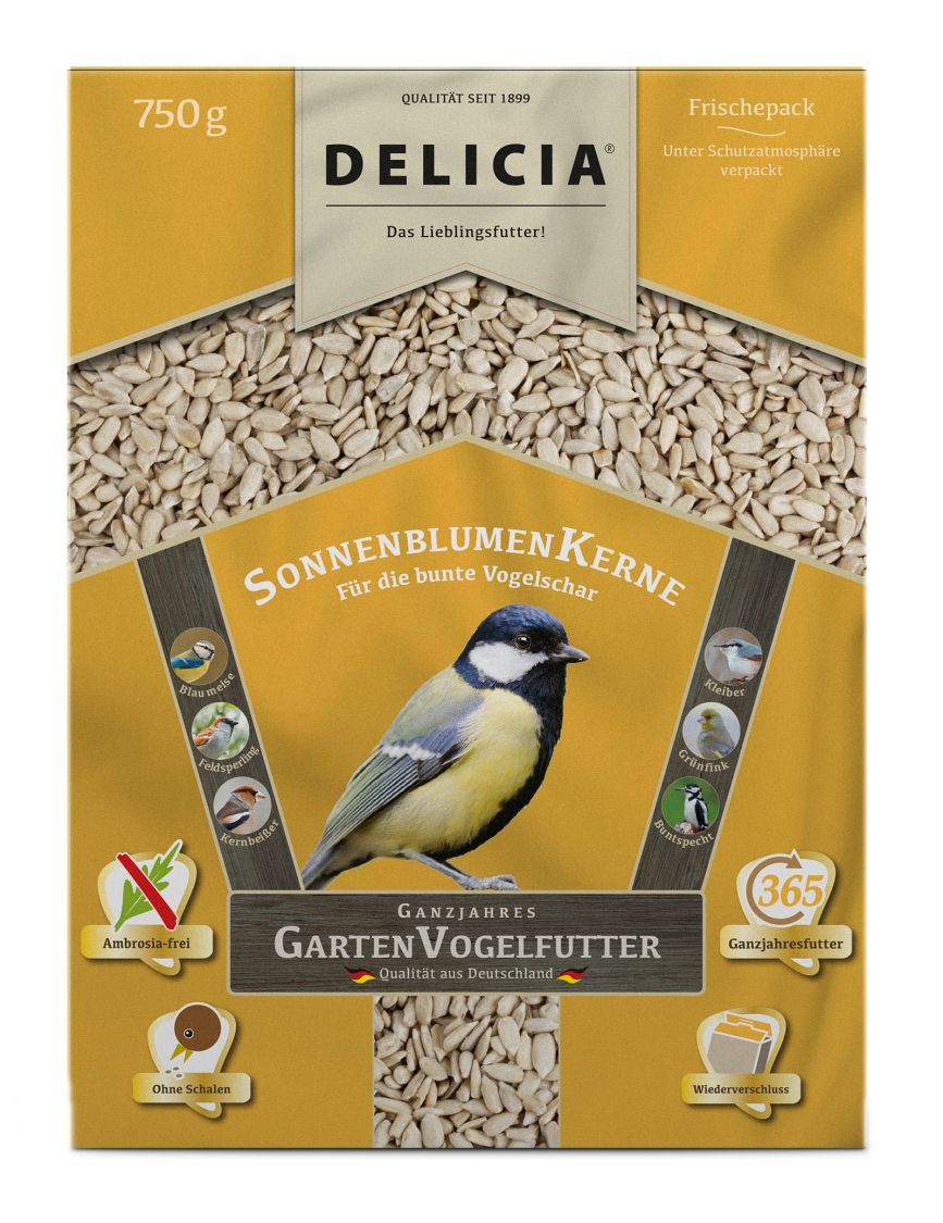 Der natürliche Lebensraum der Vögel hat sich zu ihrem Nachteil verändert. Gewichtige Gründe gibt es genug. Sie liegen in der modernen und sich veränderten Landwirtschaft und dem großzügigen Einsatz von Pestiziden. Fortschreitende Bebauung, fehlende brachliegende Flächen und penibelst aufgeräumte Gärten, tragen zur Benachteiligung der Vögel bei. Dies alles führt zu einer erschwerten Nahrungssuche und einem drastisch verkleinerten Lebensraum. Auch geeignete Nistplätze sind schwer zu finden. Elterntiere nehmen weite Flugstrecken auf sich, um ihre Brut zu ernähren. Das führt zu Defiziten bei Eltern- und Jungtieren. Sie weisen einen Mangel an Gewicht auf und sind ausgezehrt. Sie starten mit schlechten Voraussetzungen in den kommenden Winter. Mit den Delicia SonnenblumenKernen erhalten Kohlmeise, Blaumeise, Grünling und viele andere Piepmätze, das dringlich benötigte Kraftfutter in Premiumqualität. Der hohe Eiweißanteil und die ungesättigten Fettsäuren führen den Vögeln wichtige Nährstoffe zu. Der Hersteller legt großen Wert auf eine gründliche Trennung von Futter und Schalen. In diesem Futter sind keine Schalen zu finden. Das sorgt für eine saubere Futterstelle. Auch ist dieses Futter frei von Ambrosia. Damit das Picken der Körner ohne unliebsame Störungen verläuft, ist es wichtig, einen geschützten Standort für die Futterstelle zu wählen. Die Vögel brauchen die Möglichkeit, sich bei Gefahr zurückzuziehen. Die Delicia SonnenblumenKerne sind für viele Vögel eine willkommene, gesunde, leckere und energiereiche Nahrungsergänzung. An einer Futterstelle finden sich viele unterschiedliche Vögel. Hunger und mangelnde Nahrung treibt sie in lockeren Gruppen zusammen. Mit der ganzjährigen Fütterung unterstützt der Mensch den Bruterfolg und trägt zum Arterhalt vieler Vögel bei.