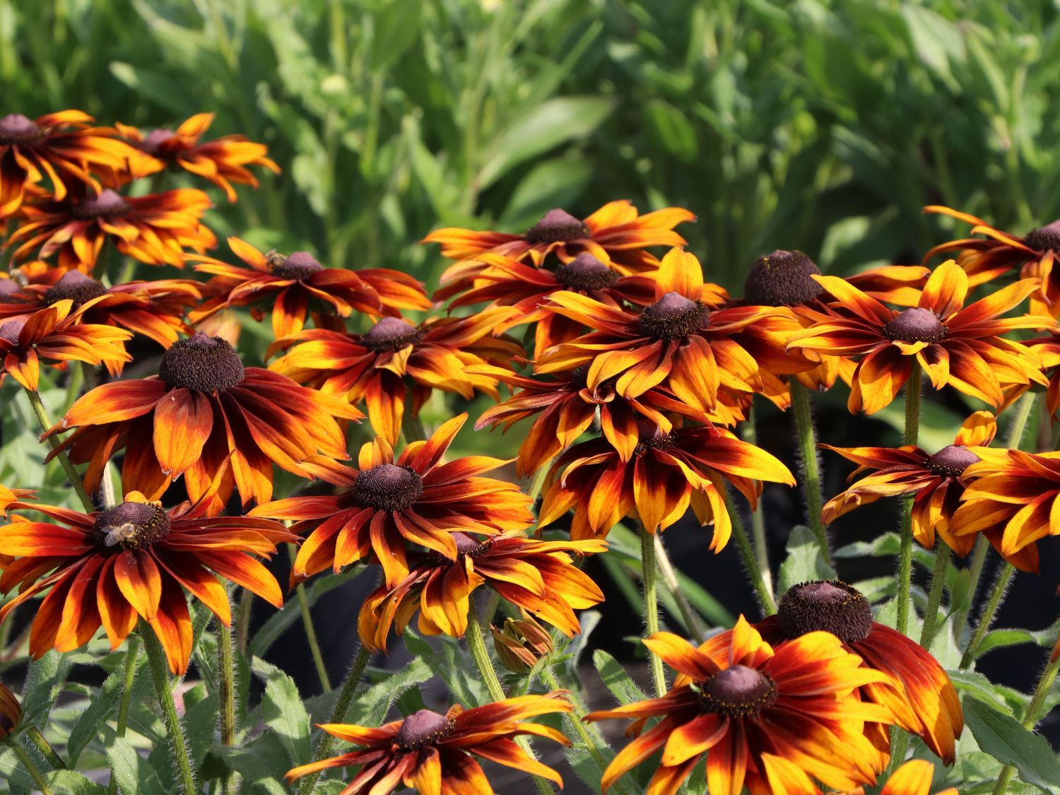 Der Sonnenhut 'Laughing SmileyZ' ist ein beeindruckender Korbblütler in kräftigen Farben von Gelb über Orange bis hin zur charaktervollen rotbraunen Blütenblattmitte, die scheinbar nahtlos in die dunkle und erhabene Mitte der Blüten übergeht. Der Anblick dieser fröhlichen und verschwenderisch blühenden Staude zaubert dem Betrachter tatsächlich ein Lächeln ins Gesicht. Die hübschen und recht großen Blüten öffnen sich bei dieser neueren Sorte zuverlässig ab Juni bis in den Oktober hinein über dem dichten, mittelgrünen, weit verzweigten Laub mit seinen lanzettlichen, leicht gezähnten Blättern. Die etwa zehn Zentimeter großen, kompakten Blüten vermitteln einen samtigen und robusten Eindruck. Bei Rudbeckia hirta 'Laughing SmileyZ', bei der sich die Blütenblätter teilweise doppelt und dreifach überlappen, handelt es sich um eine besonders gelungene Kreuzung aus einer rein gelb blühenden Sorte mit einer purpurfarben blühenden Sorte. Die Gattung Rudbeckia gehört wie die Gattung Echinacea zur Ordnung der Asternartigen und zur Familie der Korbblütler, bildet aber eine eigene Gattung, deren Handelsname Sonnenhut lautet. Die deutsche Bezeichnung der Rudbeckien als Sonnenhut geht auf die körbchenförmigen Blüten mit ihrer kegelförmigen Mitte und den herabhängenden Zungenblüten zurück, welche die Form eines Hutes ergeben. Für den Laien sind die Unterschiede tatsächlich nur schwer zu erkennen. Die ursprüngliche Heimat sowohl der Rudbeckien als auch der echten Sonnenhüte ist Nordamerika. Mitunter findet sich für die Gattung Rudbeckia auch die Bezeichnung Rauer Sonnenhut. Gruppenpflanzungen des Sonnenhuts 'Laughing SmileyZ' bilden ein wahres Blütenmeer im Garten, das Bienen, Schmetterlinge und andere Nutzinsekten magisch anzieht und für Biodiversität sorgt. Aus dieser Pracht lassen sich ohne sichtbare Verluste auch immer ein paar Exemplare für die Vase abzweigen, wo die herrlichen Blüten ebenfalls eine gute Figur machen und als sommerlicher Strauß lange das Auge erfreuen. Für eine Gruppenpflanzung sollten fünf bis sechs Exemplaren im Abstand von etwa 45 Zentimetern auf einen Quadratmeter gepflanzt werden.