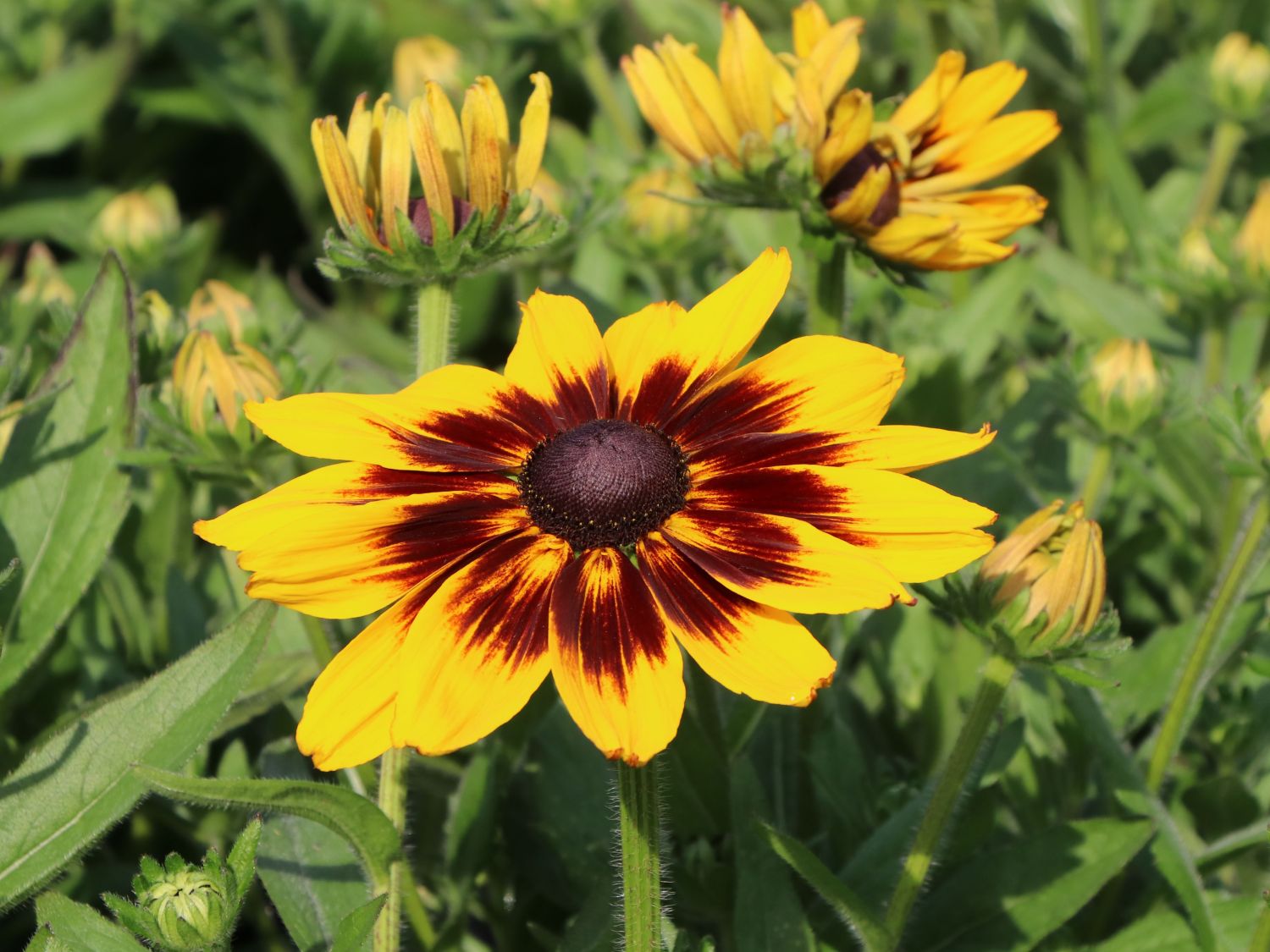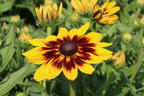 Der Sonnenhut Sunbeckia ® 'Alicia' blüht mit extrem großen Blüten und zeigt mit seinen goldgelben und mahagonifarben gestreiften Strahlenblüten Raffinesse. Aufgeblüht weisen die Blütenköpfe einen Durchmesser von bis zu 15 cm auf und sind bis zu fünf Wochen haltbar. Die Blütenpracht steht auf starken, robusten Stängeln, die sich im Laufe des Sommers laufend verzweigen. Das Äußere von (bot.) Rudbeckia Sunbeckia ® 'Alicia' bleibt mit einer Wuchshöhe von 40 cm Höhe kompakt. Ein sommerlicher Regenguss schadet den Blüten überhaupt nicht. Sie blühen auch bei schlechtem Wetter unermüdlich weiter und behalten ihre faszinierend leuchtende Blütenfarbe bei. Insekten aller Art schätzen das reiche Angebot an Pollen und Nektar und lassen sich von den kräftigen Farben bereitwillig anlocken. Zu den weiteren Vorzügen des Sonnenhuts Sunbeckia ® 'Alicia' gehört seine lange Blütezeit. Von Ende Juni bis in den beginnenden Herbst hinein bildet er ständig neue Blüten. Dieses Blühwunder ist ein echter Geheimtipp für den Garten oder für ein Pflanzgefäß auf Balkon und Terrasse. In einer gemischten Rabatte setzen kleine Gruppen leuchtende Farbkleckse zwischen andersfarbigen Stauden. Eindrucksvoll wirken größere Flächen mit ihrem weithin leuchtenden Blütenmeer.