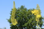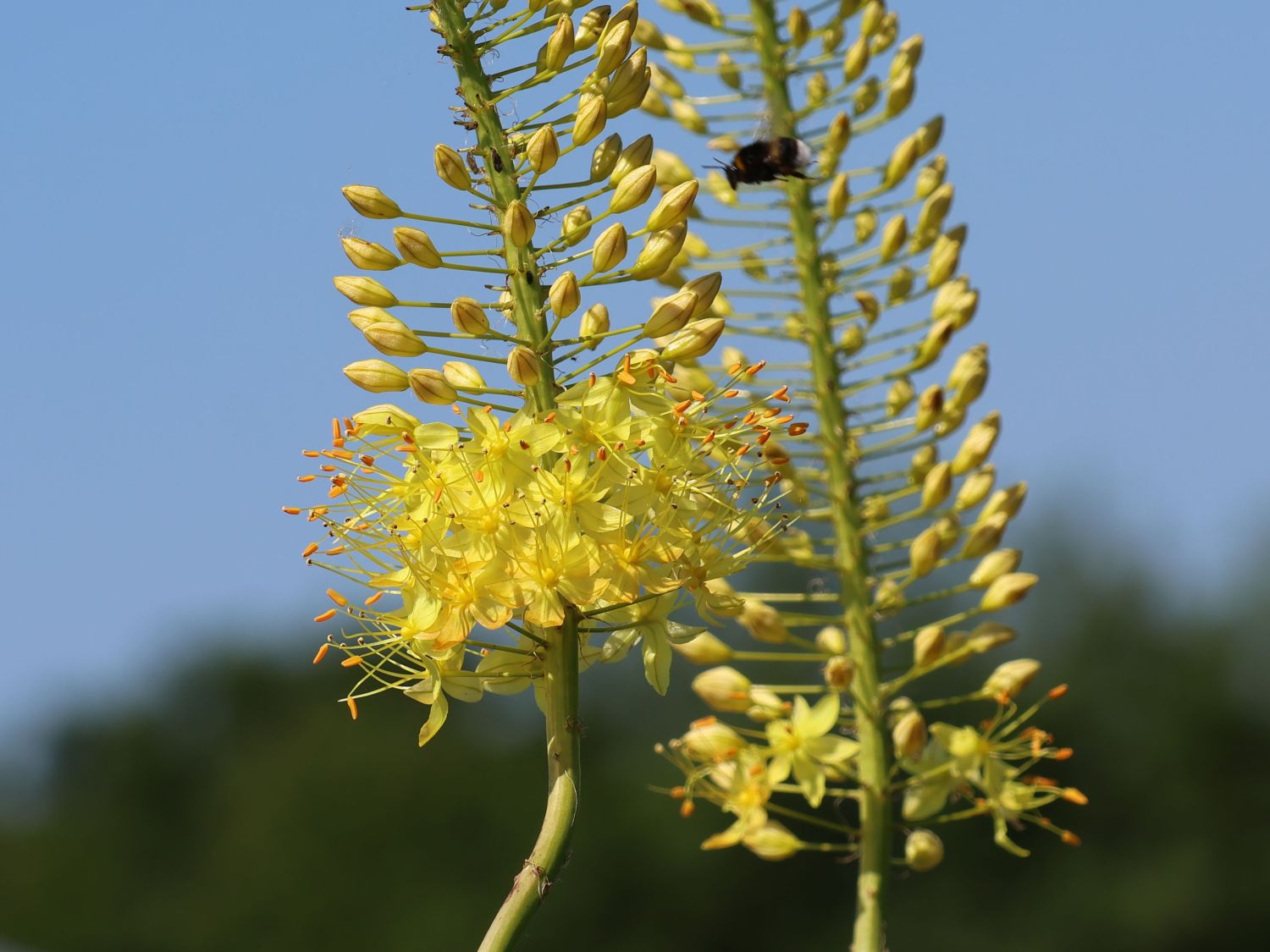 Die Steppenkerze 'Solid Yellow' ist eine phänomenale Bereicherung für jeden Garten, weil ihre leuchtenden Blüten an langen Blütenständen majestätisch im Sommer über den ausdrucksstarken Blattakzenten stehen und durch ihre einfachen Ansprüchen die pflegeleichte Gartengestaltung fördern. Im Vordergrund stehen ihre zitronengelben Blüten, die wie kleine Trauben ährenartig an langen Blütenständen bis auf eine Wuchshöhe von 150 cm sitzen. Sie öffnen sich ab Juni etagenweise, meist von unten nach oben. Nützliche Insekten finden in ihnen eine hervorragende Nahrungsquelle. Das Getümmel von Bienen, Hummeln, Schwebfliegen und Schmetterlingen sorgt für eine lebendige Dynamik und lädt zum entspannten Zuschauen ein. Die Blütenstände ziehen durch ihre Kerzenform die Blicke auf sich und bieten Unmengen an Platz für massenhafte Blüten. Damit ist ein riesiges Blütenmeer zu erreichen, das ehrwürdig auf den langen Stängeln über dem Laub schwebend wirkt. Die Blätter sind schmal, lanzettlich bis riemen- oder bandartig geformt. Sie bilden eine dichte Rosette im unteren Bereich, wodurch eine elegante Erscheinung entsteht. Bis auf eine Breite von 50 cm weitet sich das Laub teils in gebogener Haltung aus. Nachdem im Juli die Welke die Blütezeit beendet, beginnt bereits das Laub langsam abzusterben. Dies dient der Wintervorbereitung, um gut gestärkt ihre mögliche Kälteverträglichkeit bis zu -29 °C zu erzielen. Ein Abschneiden der abgestorbenen Pflanzenteile ist nicht zu empfehlen. In diesen finden Insekten ein hervorragendes Winterquartier und die Wurzeln einen Kälteschutz. Das Abschneiden ist deshalb erst im Frühjahr zu erledigen, bevor die Vegetationsperiode startet. Hier folgt ein bodennaher Rückschnitt. Während der Blühzeit fördert ein tiefes Abtrennen verwelkter Blütenstände die allgemeine Blühdauer. Wer die wunderschönen Blüten auch in der Vase genießen möchte, schneidet sie frühzeitig ab. Dort sorgen sie durchschnittlich bis zu zehn Tage für Freude und sommerliches Flair. Auch im Beet und in Rabatten gibt (bot.) Eremurus x isabellinus 'Solid Yellow' ein eindrucksstarkes Bild ab. Kombiniert mit beispielsweise niedrigen Stauden oder Ziergräsern entsteht ein fantastischer Akzent. In naturnahen Gartenanlagen ist sie eine ausgezeichnete Wahl. Beispielsweise zwischen Lavendel oder Salbei, lassen sich herausragende Insektenweiden schaffen. Oder wie wäre es zwischen Kletter- und Strauchrosen, wo sie eine harmonische Struktur bildet? Durch ihre kompromisslose Trockenheits- und Hitzeverträglichkeit ist sie die perfekte Wahl für Steingärten; auch aufgrund ihrer herausstechenden Insektenfreundlichkeit. Für den sommerlichen Touch auf Terrassen und Balkonen ist die üppig blühende Steppenkerze 'Solid Yellow' in Kübel zu kultivieren. Wichtig ist ein vollsonniger bis sonniger Standort, damit sie ihr volles Blühvermögen zum Besten geben kann.