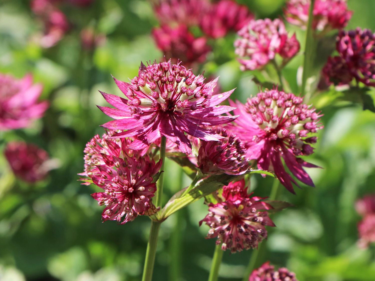 Die Sterndolde 'Abbey Road' ist eine neuere Sorte und begeistert durch ihre interessante Farbkombination. Diese besteht aus dunkel-purpurroten Blüten auf dunklen Stielen und glänzenden grünen Blättern mit weißen Blattachseln. (Bot.) Astrantia major 'Abbey Road' schmückt sich von Juni bis Juli und im September mit filigranen sternförmigen Blüten. Das Purpurrot der kleinen Blütenköpfchen ist elegant und hebt sich von vielen anderen rotblühenden Blumen ab. Die schöne Staude ist mehrjährig und überzeugt auf viele Arten. Sie schmückt das Beet, den Kübel und die Vase. Die Sterndolde 'Abbey Road' bezaubert mit ihrem romantischen Charme und ihrem reizvollen Wildblumen-Charakter. Die Sterndolde gehört zur Familie der Doldenblütler und wächst ausdauernd krautig. Die Wildform wächst in Europa in Wäldern, auf Wiesen sowie an Gewässerrändern. Die Sterndolde 'Abbey Road' erreicht eine Wuchshöhe von 60 bis 70 Zentimeter. Die Pflanze ist ein toller Blickfang im Staudenbeet und erfreut den ganzen Sommer hindurch. Die dunkelroten Blüten erreichen einen Durchmesser von rund vier Zentimter. Die Dolde in der Mitte ist von einem sternförmigen Kranz aus purpurroten Blütenblättern umsäumt. Die Blüten verströmen einen leichten Duft, der Bienen, Hummeln oder Schmetterlinge anlockt. Die dunkel purpurfarbenen Blüten stehen in Trauben an dünnen Stängeln. Die handförmig gefingerten Laubblätter heben sich markant von den roten Blüten ab. Es empfiehlt sich, die vertrockneten Blüten nach der Hauptblüte abzuschneiden. Das spornt Astrantia major 'Abbey Road' zu einer großartigen Nachblüte im Spätsommer an.