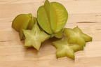 Die Sternfrucht / Karambola ist hierzulande schon länger bekannt. Ihr Name verweist auf die sternförmige Silhouette nach dem Aufschneiden. Die exotische Frucht wird gerne zur Dekoration von festlichen Desserts und Obstsalaten verwendet. Das saftige Fruchtfleisch schmeckt süß-sauer und enthält viel Vitamin C. Die festere Schale ist essbar. (Bot.) Averrhoa carambola stammt ursprünglich aus Südostasien und wird mittlerweile weltweit in den tropischen Breiten kultiviert. Die wärmeliebende Pflanze eignet sich in Europa als Kübelpflanze für Wintergarten und Wohnräume. Averrhoa carambola wächst in tropischen Gefilden langsam zu einem immergrünen Baum von 5 bis 10 Metern heran. Kübelpflanzen erreichen eine Höhe von bis zu 300 cm. Auf einem kurzen Stamm verzweigen sich viele Äste, dennoch wirkt der Wuchs der Sternfrucht / Karambola locker und leicht verzweigt. Die mittelgrünen gefiederten Laubblätter stehen wechselständig an den äußeren Zweigen. Ein zarter Flaum überzieht Blatt und Stiel. Ein Teilblatt dieser Fiederblätter ist rund 5 cm lang, insgesamt erreichen die aus bis zu 13 Einzelblättern bestehenden Fieder eine Länge von 30 cm. Die Blättchen sind licht- und bewegungssensitiv, das heißt, sie falten sich nachts, bei Trockenheit und bei zu starker Sonneneinstrahlung zusammen. In ihrer tropischen Heimat sind die Sternfrüchte immergrün. In unseren Breiten hängt das Verhalten der Pflanzen von der Temperatur im Winterquartier ab. Je kühler der Winterstandort, desto eher wird ein Großteil des Laubes abgeworfen.