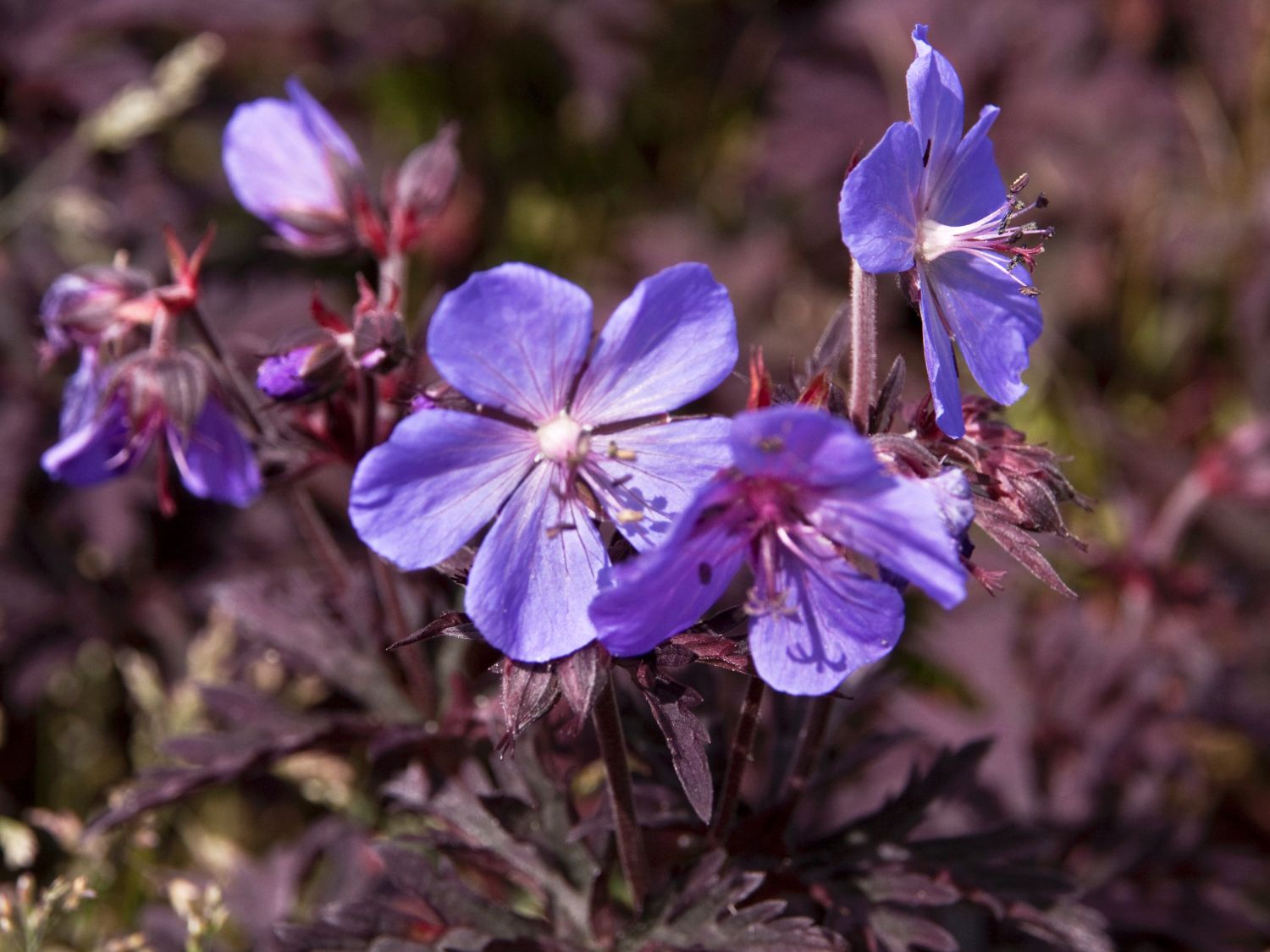 Der Storchschnabel 'Dark Reiter' ist eine ganz besondere Züchtung. Die grünlich-braunen bis dunkelroten gefiederten Blätter stehen in einem bezaubernden Kontrast zu den violettblauen Blüten mit einer weißen Mitte. Die üppig blühende Geranie erfreut von Juni bis in den späten August und September hinein mit ihren schalenförmigen Blüten. Die sommergrüne, horstig wachsende Zierpflanze eignet sich ganz hervorragend als Bodendecker und zur Unterpflanzung von lichten Hecken, Stauden, Bäumen und Gehölzrändern. Zudem ist Geranium pratense 'Dark Reiter' eine wunderbare Bienenweide, die auch Schmetterlinge und viele weitere Nutzinsekten anzieht. Der Storchschnabel 'Dark Reiter' ist ausgesprochen anspruchslos. Er bevorzugt einen normalen, frischen, feuchten, durchlässigen und humosen Boden, kommt im Grunde aber mit so gut wie jeder Art von Boden zurecht. Der Standort sollte sonnig bis halbschattig sein. Die Staude zeichnet sich durch einen lockeren, horstbildenden Wuchs aus. Sie wird etwa 60 bist 70 Zentimeter hoch und erreicht Breiten von 40 bis 50 Zentimetern. Dieser besondere Storchschnabel kann auch sehr gut als Kübelpflanze auf der Terrasse oder dem Balkon gehalten werden. Das Pflanzgefäß dafür sollte mindestens 20 Zentimeter Durchmesser und ein Fassungsvermögen von fünf Litern haben.