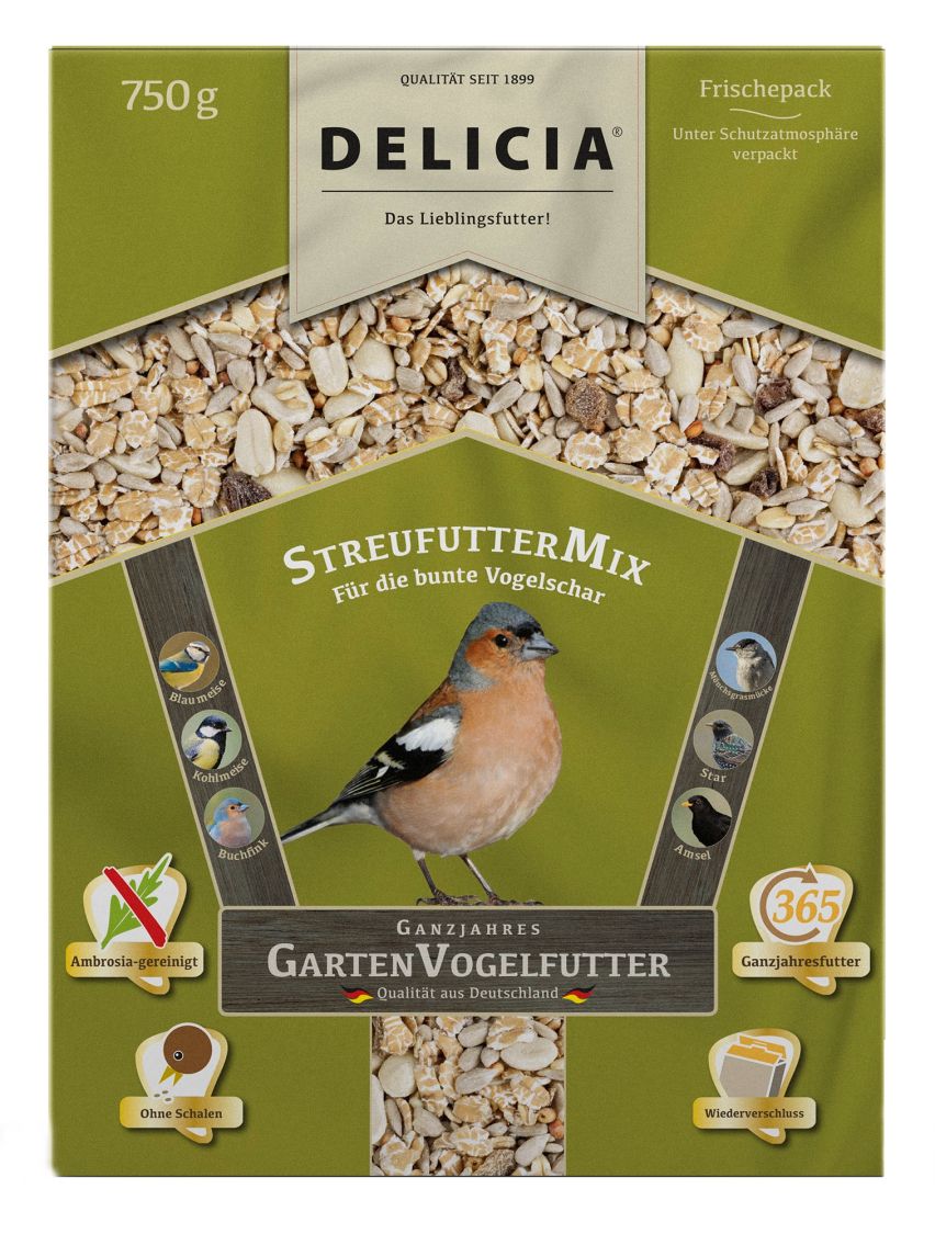 Nach der schweren Winterzeit folgt die Paarungs- und Brutzeit. Daran schließt die Aufzucht der Jungvögel an. Die Elterntiere sind ausgezehrt. Dadurch schaffen sie oftmals die Aufzucht nicht oder starten geschwächt und unterernährt in die bevorstehende Winterzeit. Auch die Jungvögel bekommen nicht die ausreichenden Mengen, um gestärkt und mit einem guten Ausgangsgewicht in den ersten Winter ihres Lebens zu starten. So geht der Überlebenskampf weiter. Aus diesen Gründen füttern viele Vogelfreunde ganzjährig. Sie unterstützen die Tiere durch das ganze Jahr hindurch mit einem ausgewogenen Zusatzfutter. Dem Hersteller dieses wertvollen Premiumfutters, liegt die Sauberkeit des Futters in besonderer Weise am Herzen. Die Produktion unterliegt einer sorgsamen Überwachung. Schalen sind im Futter nicht zu finden. Das hält die Futterstelle länger sauber. Viele Futterprodukte auf dem Markt sind stark mit Ambrosiasamen verunreinigt. Aber nicht der Delicia StreufutterMix! Die strengen Kontrollen sorgen für ein von Ambrosia befreites Futter. In der Nähe von Hecken oder Sträuchern ist eine Vogelfutter-Station oder ein Vogelhaus perfekt positioniert. Die Vögel bleiben gerne länger im Garten. Von drinnen lassen sich die gefiederten Freunde schön beobachten. Die Futterstelle schützt der Gärtner vor der Witterung und achtet auf einen Platz, der außerhalb des Zugriffs von Fressfeinden liegt. Vielen Kindern und Jugendlichen bietet sich ein unbekanntes Schauspiel der Natur. Es ist unglaublich, wie viele verschiedene Vogelarten sich an einer Futterstelle erfreuen. Das zu beobachten, ist eindrucksvoller und lehrreicher als jedes Biologiebuch!