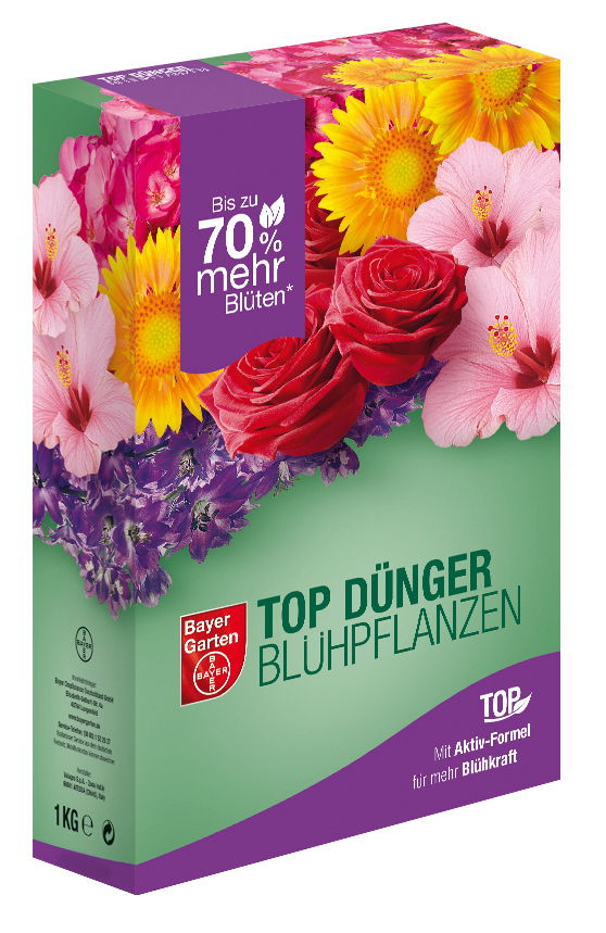 Blühende Pflanzen sind die Lieblinge in Gärten, auf Balkonen, in Wintergärten und auf der Terrasse. Ob im Beet, im Blumenkasten oder im Kübel, sobald der Frühling Einzug hält, dauert es nicht mehr lang bis die ersten leuchtenden Blüten sichtbar sind. Dank der unerschöpflichen Sortenvielfalt ist es möglich die Blüte von Frühling bis Herbst zu bestaunen. Speziell in Beeten sind blühende Stauden und natürlich die Königin der Pflanzen, die Rose, sehr beliebt. Um den Garten, Balkon oder die Terrasse in das wunderschöne Blütenmeer zu verwandeln benötigen die Pflanzen eine gute Pflege. Neben der notwendigen Wässerung ist auch die bedarfsgerechte Ernährung grundlegend. Hierfür eignen sich so genannte Volldünger bestens. Diese enthalten die Hauptnährstoffe Stickstoff, Phosphor und Kalium in ausgewogener Dosierung und somit neben dem Wasser die Lebensgrundlage der Gewächse. Stickstoff (N) ist der Wachstumsmotor, er sorgt für kräftigen und gesunden Wuchs. Phosphor (P) unterstützt die Blütenbildung und die gesunde Blattfarbe da es die Chlorophyllbildung positiv beeinflusst. Kalium lässt die Blüten so leuchten wie wir Gärtner es uns wünschen, zudem sorgt es für stabile Zellwände und damit einen robusten Wuchs. Bayer Garten bietet mit dem TOP Dünger Blühpflanzen die Ernährungsgrundlage für alle blühenden Pflanzen im Garten und in Töpfen. Der bestens zusammengestellte Nährstoffcocktail aus den Hauptnährstoffen versorgt die Pflanzen grundlegend. Die ebenfalls enthaltenen Spurenelement und biologischen Aktivstoffe schließen mögliche Versorgungslücken, verbessern die Nährstoff- und Wasseraufnahme und machen das Gesamtpaket komplett. Bei solch einer bedarfsgerechten Nährstoffgabe leuchtet die üppige Blütenpracht bis in weite Ferne. Bestens ist das Düngegranulat für blühende Stauden und Rosen geeignet.