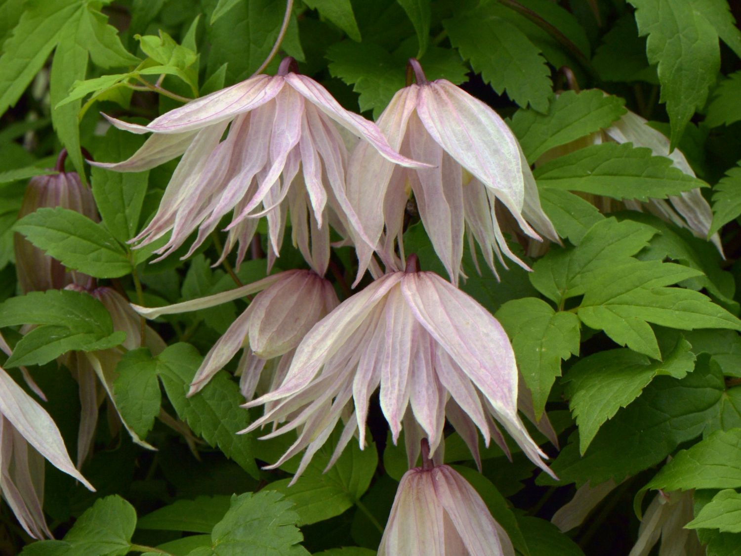 Die Waldrebe 'Pink Swing' ist eine polnische Züchtung, die sich durch ein üppiges Blütenkleid mit fantastischen Formen, einem bezaubernden Laub und hervorragender Pflegeleichtigkeit seit 2012 in die Herzen von Hobbygärtnern und Pflanzenliebhabern schleicht. Die halbgefüllten Blüten erreichen eine Größe zwischen 10 cm und 13 cm. Zahlreiche elliptisch geformte und spitz zulaufende Kelchblätter arrangieren sich zu einem glockenähnlichen Korpus. Ihren Namen verdankt (bot.) Clematis 'Pink Swing' den nach außen gebogenen Blütenblättern, die ihnen eine Optik wie schwingende Schaukeln verleihen. Im Blüteninneren befinden sich zahlreiche Staubblätter. Diese verlaufen überwiegend gerade nach unten und sind ebenso lang oder kürzer als die Kelchblätter sowie leicht gewellt. Die Kelchblätter zeichnen sich an den Außenseiten in einem zart-rosafarbenen Ton. Die Unterseiten sind heller mit einer cremefarbigen Nuance. Die sogenannten Staminoidien sind hingegen mit einem hellrosafarbenen Ton umrandet, der sich zur Mitte hin bis zu einem hellen Cremeweiß aufhellt. An den Staubblättern bilden sich gelbliche Staubbeutel, die perfekt mit den ebenfalls cremefarbenen Stempeln harmonieren. Die Hauptblütezeit beginnt je nach Wetterbedingungen, im April oder Mai und endet spätestens im Juni. Im Juli zeigt sich größtenteils eine Nachblüte, die bis August den Sommergarten auf attraktive und elegante Weise bereichert. Visuell perfektioniert das dunkelgrüne Laub, das in sommergrüner Version mit einer Größe bis 20 cm ab zeitigem Frühjahr bis zum Abfall im Herbst schicke dekorative Akzente setzt. Dreizählig gefiedert, breit-elliptisch bis lanzettlich geformt und spitz zulaufend sowie mit gezähntem Rand entspricht das Laub keiner 08/15-Ausführung, sondern bildet eine dynamische Ausstrahlung, die die Blicke auf sich zieht. Die Blätter sitzen an den zahlreich verzweigten Trieben, wo sie für ein dichtes Wuchsbild sorgen. Diese sind schlingfähig und suchen Halt an unebenen und zu umrandenden Hintergründen. Damit zählt die Waldrebe 'Pink Swing' zu den Kletterpflanzen, die ohne nach oben verlaufenden Haftgrund auf dem Boden seitlich rankt. Erreicht sie aufrecht wachsend eine Wuchshöhe bis 300 cm und eine -breite bis 150 cm, breitet sie sich als liegender Bodendecker bis zu 300 cm aus.