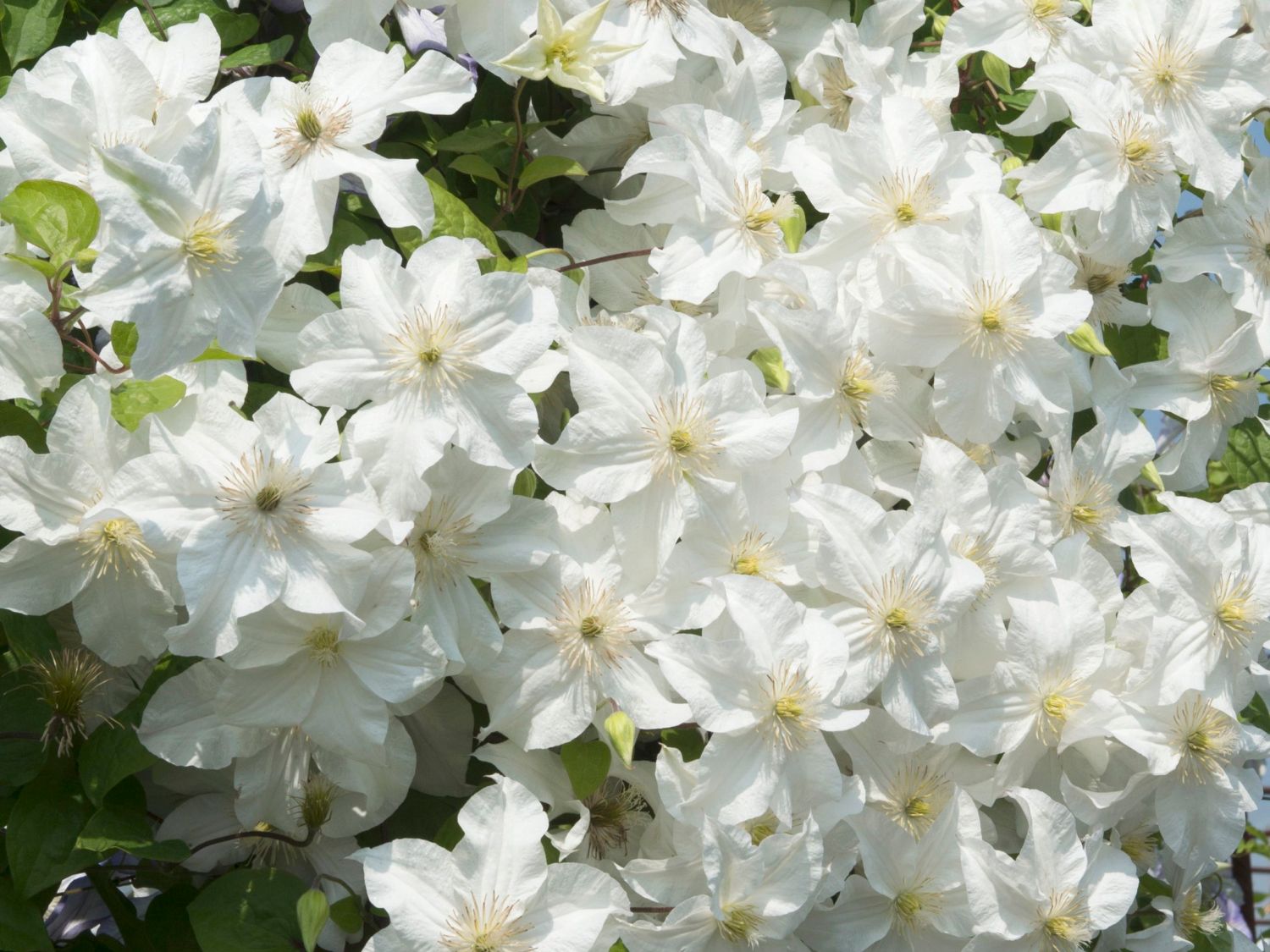 Die Waldrebe 'Snow Storm' ist eine herausragende Clematis mit einer spektakulären, schneeweißen Blütenpracht. Diese außergewöhnliche Sorte wurde vom renommierten polnischen Züchter Szczepan Marczynski entwickelt. Mit ihrem kletternden, aufrechten Wuchs erreicht die Pflanze eine beeindruckende Höhe von 2 bis 2,5 Metern. Sie wächst dicht verzweigt und bildet eine üppige, grüne Wand aus Laub und Blüten. Die Blätter sind herzförmig und haben einen hellgrünen, matten Farbton. Im Gegensatz zu vielen anderen Clematis-Sorten verliert (bot.) Clematis 'Snow Storm' im Herbst ihr Laub. Die reinweißen Blüten erscheinen Mitte Juni und zeigen sich bis Ende Juli in einer unglaublichen Fülle. Die Blüten sind so zahlreich, dass in dieser Zeit die Blätter kaum zu sehen sind. Von Ende September bis Anfang Oktober kann es zu einer Nachblüte kommen, die allerdings weniger üppig ausfällt. Die einfachen, tellerförmigen Blüten haben einen Durchmesser von 10 bis 14 cm. 5 - 6 leicht gewellte Blütenblätter umgeben hellgelbe Staubgefäße in der Mitte. Für die Kultivierung der 'Snow Storm' ist ein fruchtbarer, gut durchlässiger Boden notwendig, der mäßig feucht bleibt. Der ideale pH-Wert des Bodens liegt zwischen 6 und 7, also neutral oder leicht sauer. Die Waldrebe 'Snow Storm' gedeiht am besten an einem sonnigen bis halbschattigen Standort, an dem sie vor starkem Wind geschützt ist. Es ist wichtig, die Pflanze regelmäßig zu gießen, vor allem während der Vegetationsperiode.
