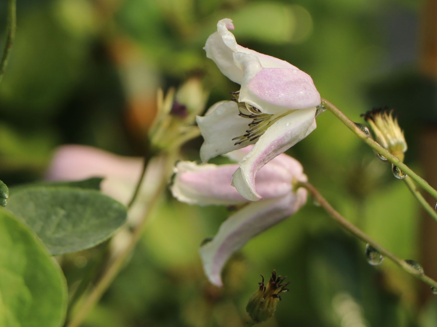 Die Blüten der Waldrebe / Vasevine 'Elf' sind ungefüllt und locken Bienen und Hummeln auf der Suche nach wertvoller Nahrung an. Nach der Blühphase bilden sich kleine Fruchtkapseln. Am neuen Austrieb dieser holzigen Kletterer bilden sich die Blüten, die sich jeweils mit 4 Tepalen schmücken. Auch an großen Sträuchern oder mit einer Konifere als stützende Begleitung bietet die Waldrebe / Vasevine 'Elf' einen schmückenden Anblick. Die Blüten lassen sich auch als Schnittblumen verwenden, sind allerdings in der Vase nicht sehr lange haltbar. Die winterharte Pflanze benötigt lediglich in extrem rauen Lagen einen Winterschutz. In der Regel ist sie bis -15°C winterhart. Clematis benötigen einen beschatteten Fuß, daher ist es empfehlenswert, den Wurzelballen 5 cm tiefer als im Topf einzupflanzen.