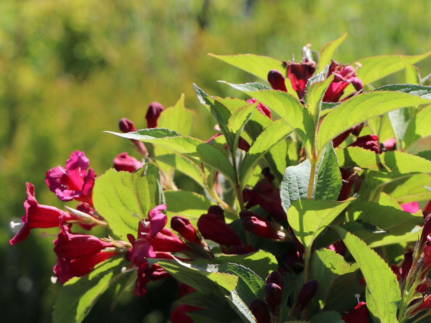 Unzählige Blüten in einem intensiv leuchtenden Rot bedecken im späten Frühling den wunderschönen Zierstrauch. Sie bezaubern den Betrachter mit ihrer anmutigen Glockenform. Zu dem tiefen Dunkelgrün des dekorativen Laubes bilden sie einen strahlenden Kontrast. Die Weigelie 'Eva Supreme' ist ein opulenter Zierstrauch, der mit seiner reichen Blütenpracht, seinem Blattschmuck und mit seiner reizvollen Wuchsform begeistert. Sie ist an vielen Stellen im Garten eine Augenweide und eignet sich hervorragend als Heckenpflanze. Für Schadinsekten und Krankheiten ist sie wenig anfällig. Sie ist frosthart, robust und industriefest. Weigela 'Eva Supreme' wächst als aufrechter und buschiger Strauch. Ihre Zweige hängen breit über und verleihen ihr eine üppige, ansprechende Form. Sie erreicht eine Höhe von 200 bis 250 Zentimetern und eine Breite von 200 bis 300 Zentimetern. Pro Jahr legt sie zwischen 15 und 30 Zentimetern zu. Die Weigelie 'Eva Supreme' bildet längliche, elliptisch bis oval geformte, nach vorn spitz auslaufende Blätter aus. Ihr sommergrünes Laub schimmert in einem satten, dunkelgrünen Farbton. Von Mai bis Juli schmückt sich der Zierstrauch mit seinem atemberaubend schönen Flor. Die eleganten, glockenförmigen Blüten sorgen mit ihrem strahlenden Rot für ein märchenhaftes Farbenmeer.