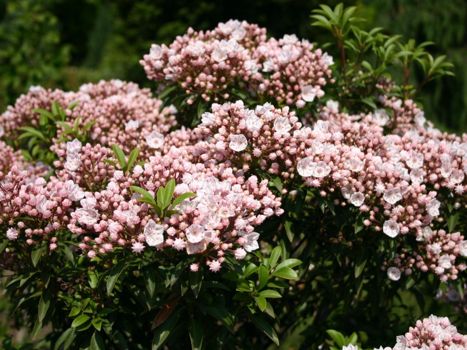 Junge Knospen zeigen sich als kleine Sternchen, sind leicht rosa getönt und wirken zurückhaltend. Geöffnete Blüten wirken zackig, sind komplett weiß und sie überraschen mit malerischen, kreisförmig angeordneten Staubgefäßen. Der Blütenschlund ist hellgrün und die Staubbeutel zeigen sich auffällig lila gefärbt. An den Enden der Zweige entwickeln sich vielblütige Dolden, die im Juni das Aussehen des Strauchs bestimmen. Sie fesseln Betrachter durch ihr Spiel aus geschlossenen und geöffneten Blüten sowie ersten Samenkapseln. Der Zierstrauch schenkt Hummeln und Bienen viel Blütenpollen. Die Laubblätter erreichen eine Länge bis zehn Zentimeter und haben eine glänzende Oberfläche. Kalmia latifolia 'Elf' wächst auf einem flachen, reich verzweigten und dichten Wurzelstock. Die Pflanze nutzt ausschließlich die obere Erdschicht und mag frische und durchlässige Erde mit Humus, die im sauren Bereich liegt. Der Strauch ist gerne ungestört und entwickelt sich langsam. Er mag einen sonnigen Standort oder einen Platz im Halbschatten. Unter schattenspendenden Bäumen bieten sich ausgezeichnete Orte für locker gepflanzte Gruppen. Unter einem Blätterdach spielen Sonnenflecken auf dem Weißblühenden Berglorbeer 'Elf' und verstärken die zauberhafte Anmut des Strauchs. Alle Teile der Pflanze enthalten giftige Wirkstoffe. Gärtner verzichten auf einen regelmäßigen Rückschnitt und setzen auf die natürliche Form, die ebenso hoch wie breit ist. Die Sorte ist bis -20 °C winterhart. Ein frisch gepflanztes Exemplar oder eine Jungpflanze benötigen im ersten Jahr Winterschutz. Unter Laubbäumen hilft das herabgefallene trockene Laub, während an einem anderen Ort Nadelreisig und Mulch die Wurzeln bedecken. In Pflanzgefäßen bekommt der Berglorbeer Wurzelschutz durch Wärmevlies und Reisig zwischen den Zweigen. Durch geringen Pflegeaufwand blüht die Kalmia latifolia 'Elf' zur Freude ihrer Liebhaber viele Jahre.